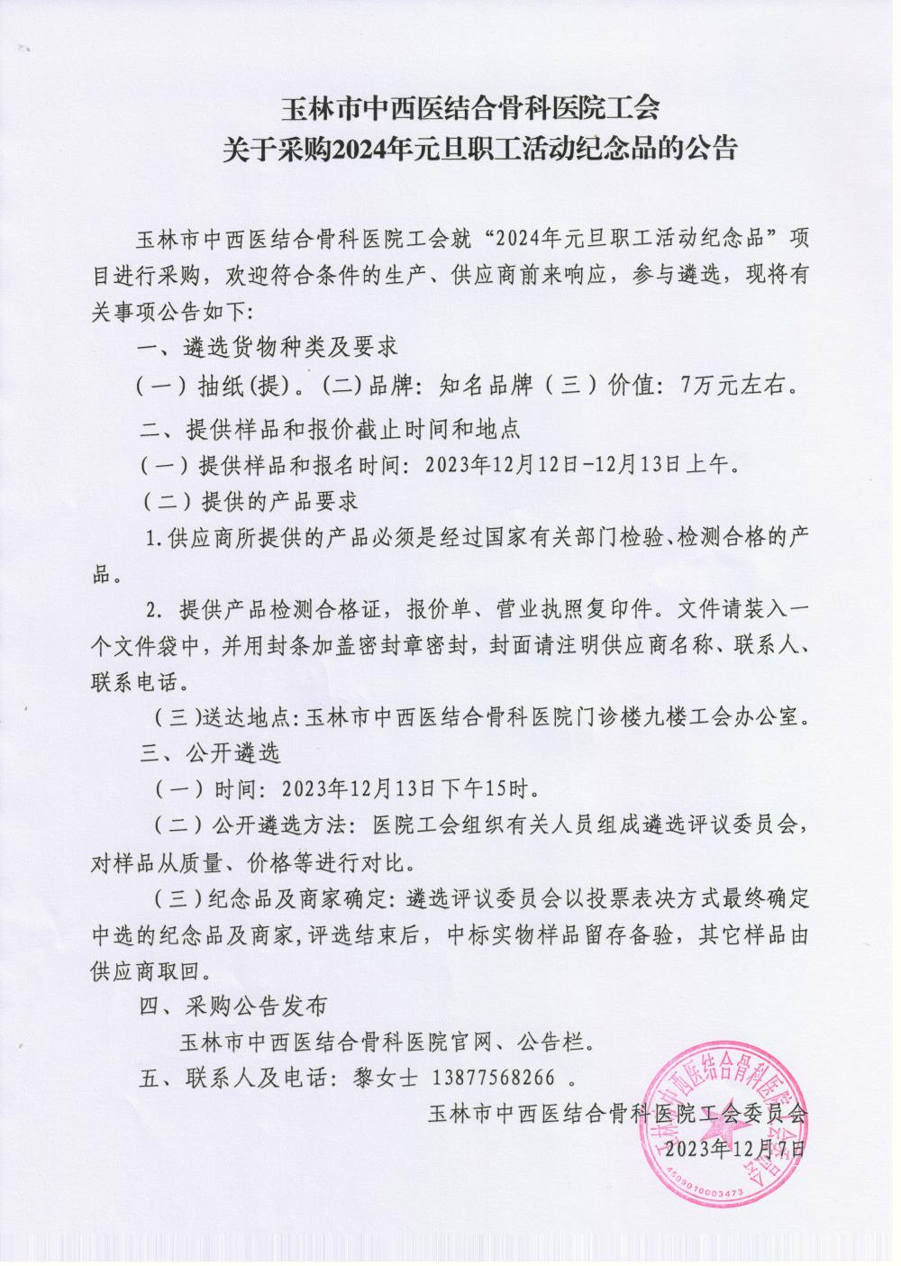 玉林市中西医结合骨科医院工会关于采购2024元旦职工活动纪念品的公告