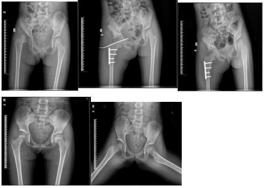 右髋关节发育性脱位行Pemberton髋骨截骨,股骨短缩旋转术后随访5年,股骨头与髋臼发育良好。
