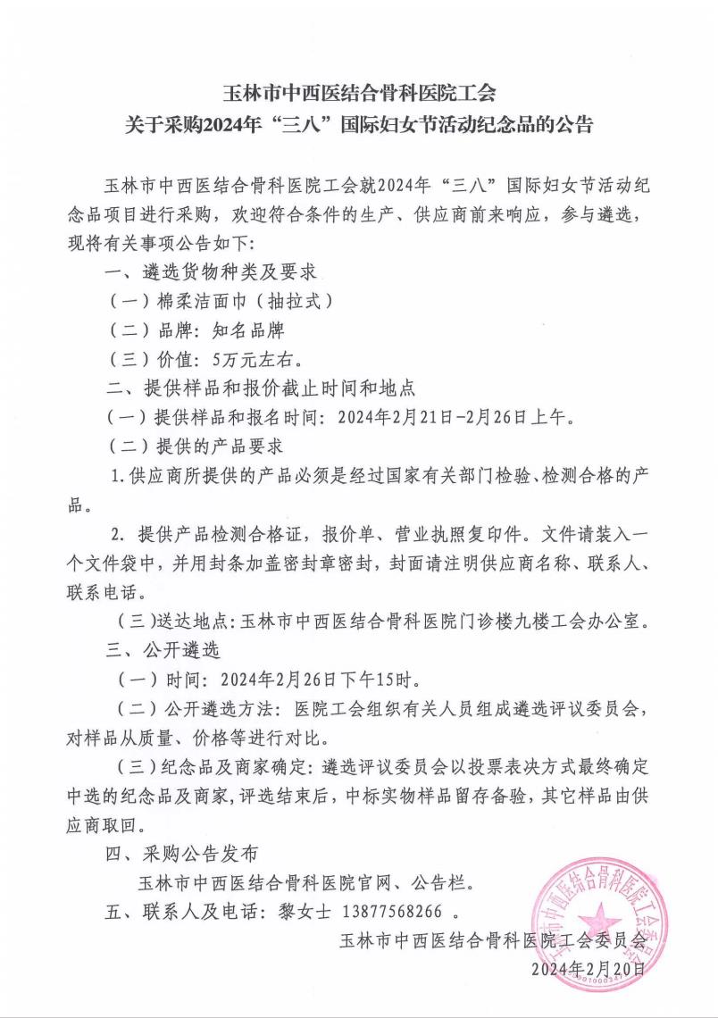 玉林市中西医结合骨科医院工会关于采购2024年“三八”国际妇女节活动纪念品的公告