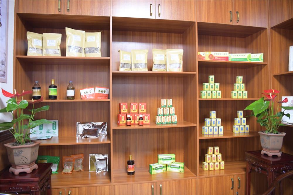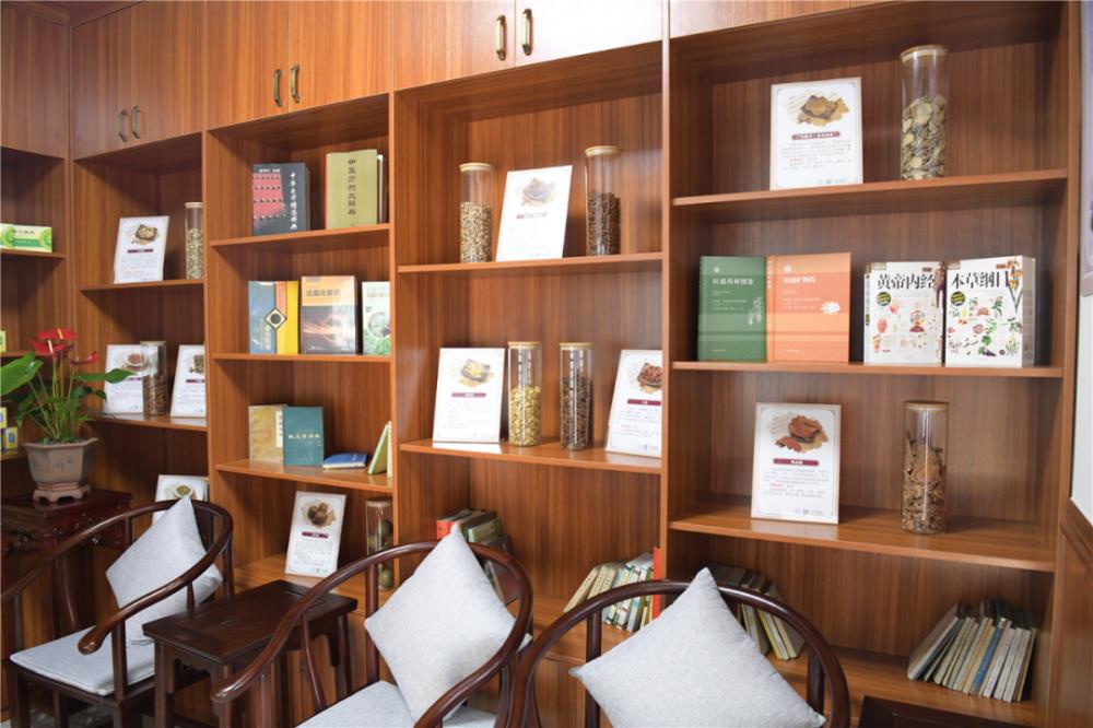 名医堂内设置极具中医氛围的候诊区,展示有医院特色院内制剂、中医药书籍、桂十味、中医传统文化挂画等内容。