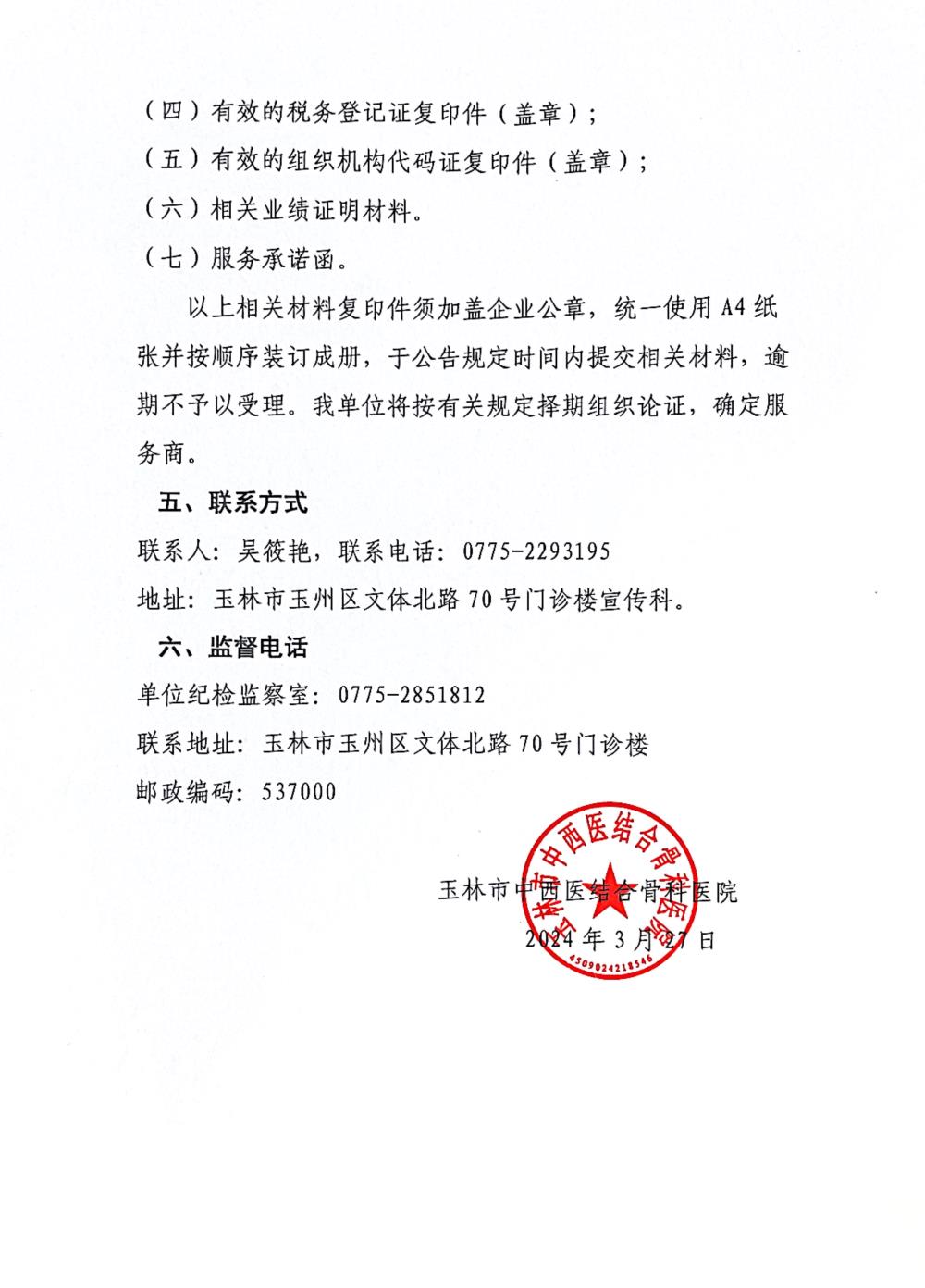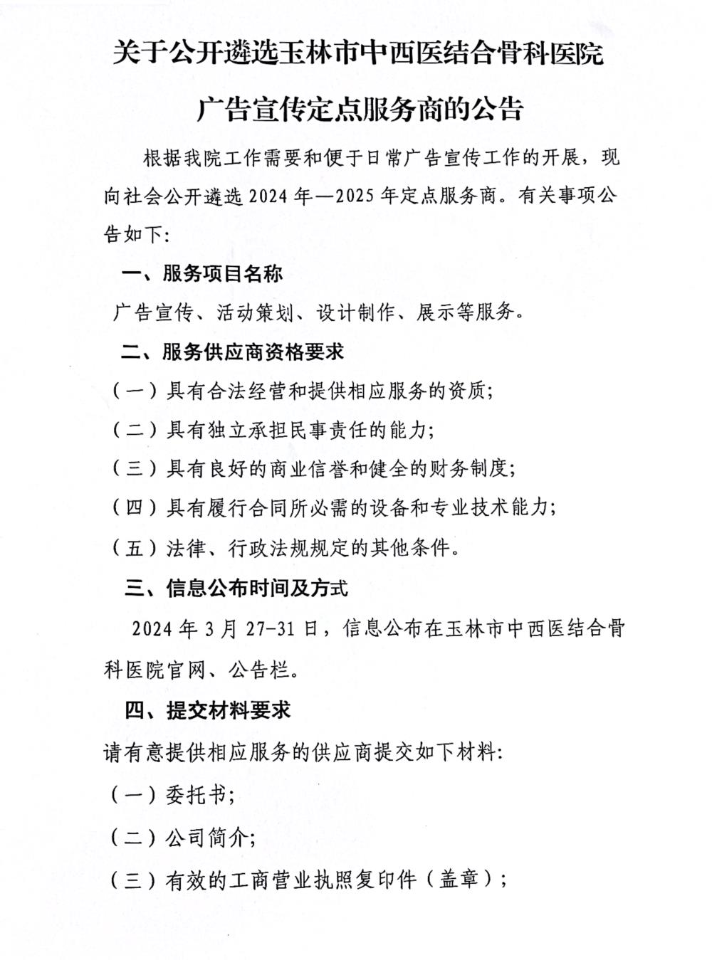 关于公开遴选玉林市中西医结合骨科医院广告宣传定点服务商的公告