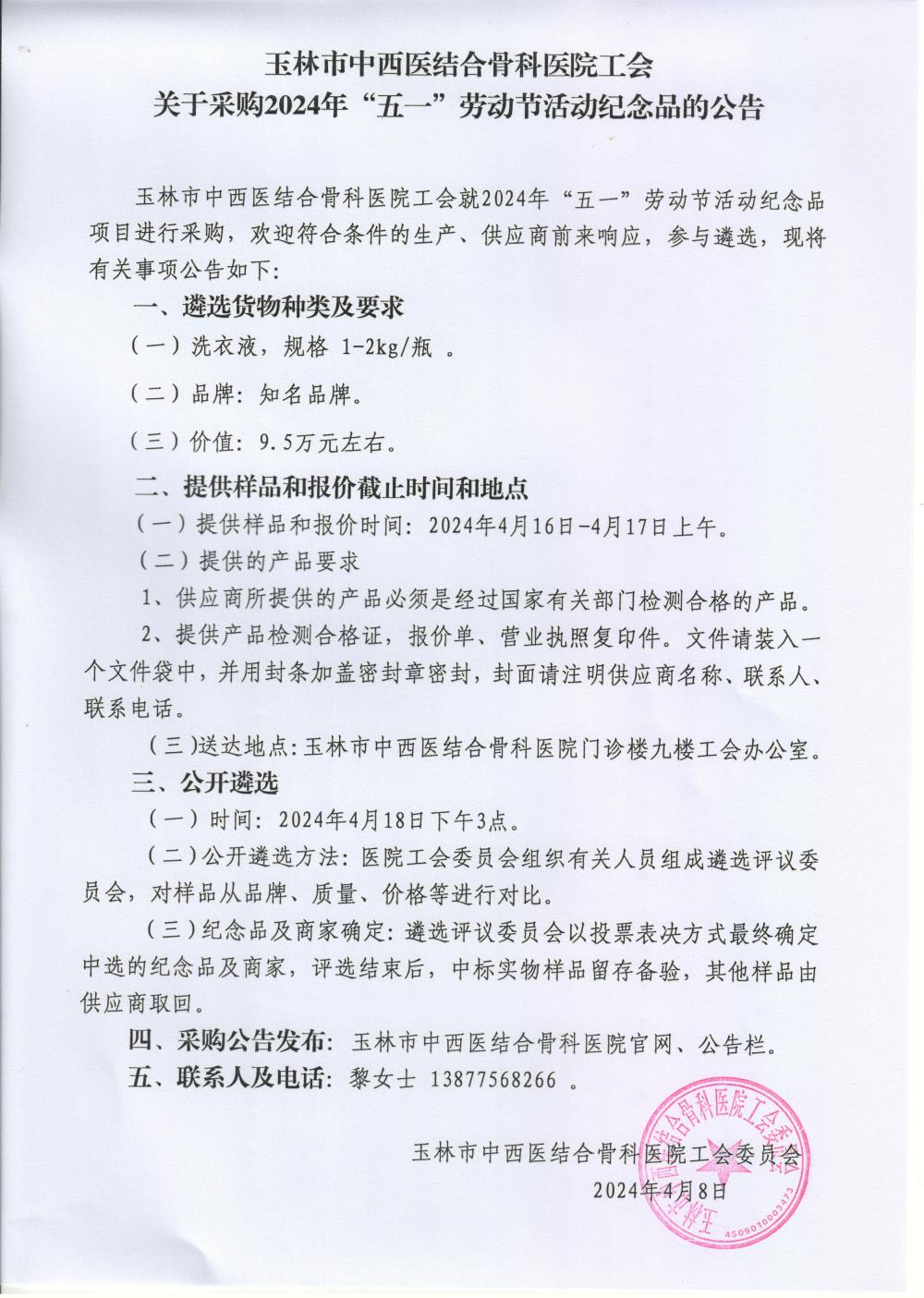 玉林市中西医结合骨科医院工会关于采购2024年“五一”劳动节活动纪念品的公告
