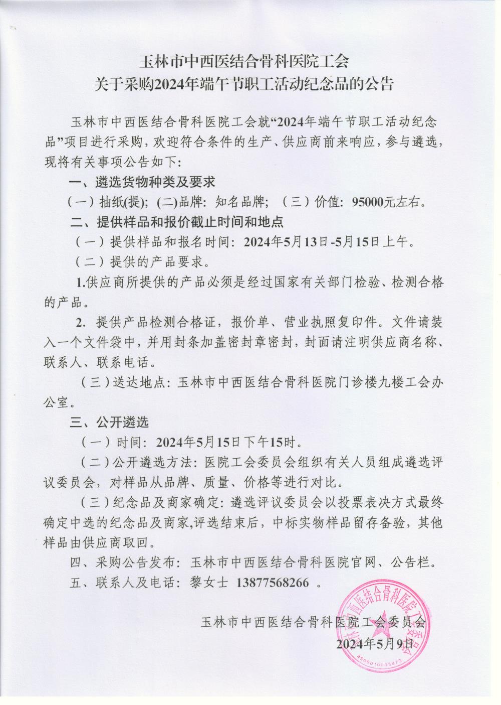 玉林市中西医结合骨科医院工会关于采购2024年端午节职工活动纪念品的公告