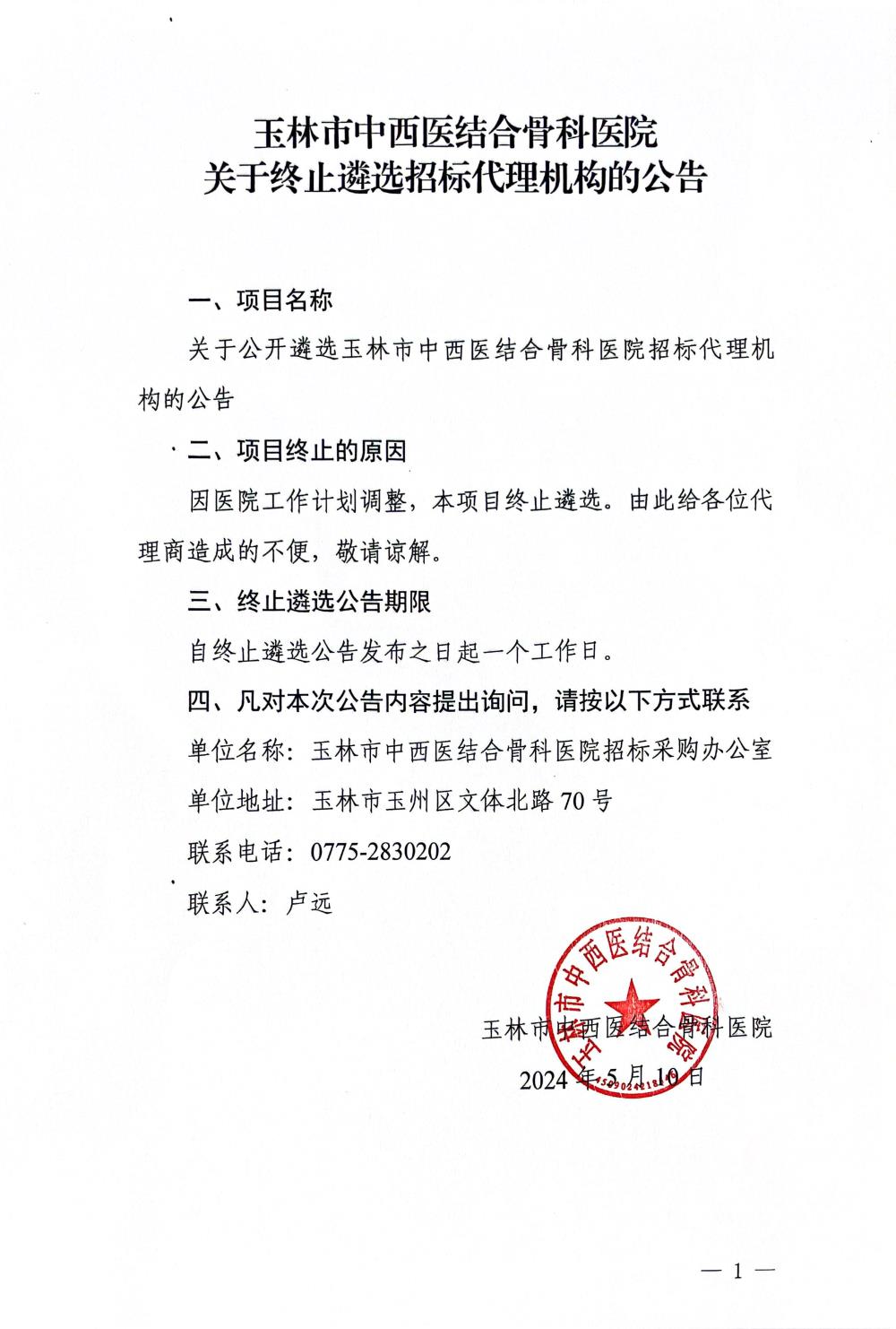 玉林市中西医结合骨科医院 关于终止遴选招标代理机构的公告