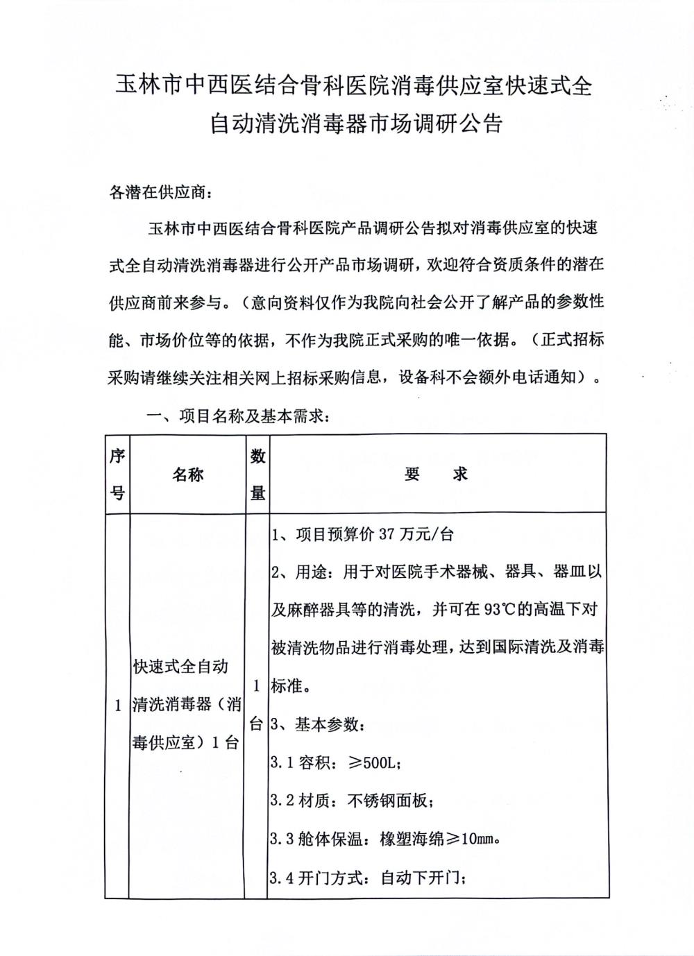 玉林市中西医结合骨科医院消毒供应室快速式全自动清洗消毒器市场调研公告