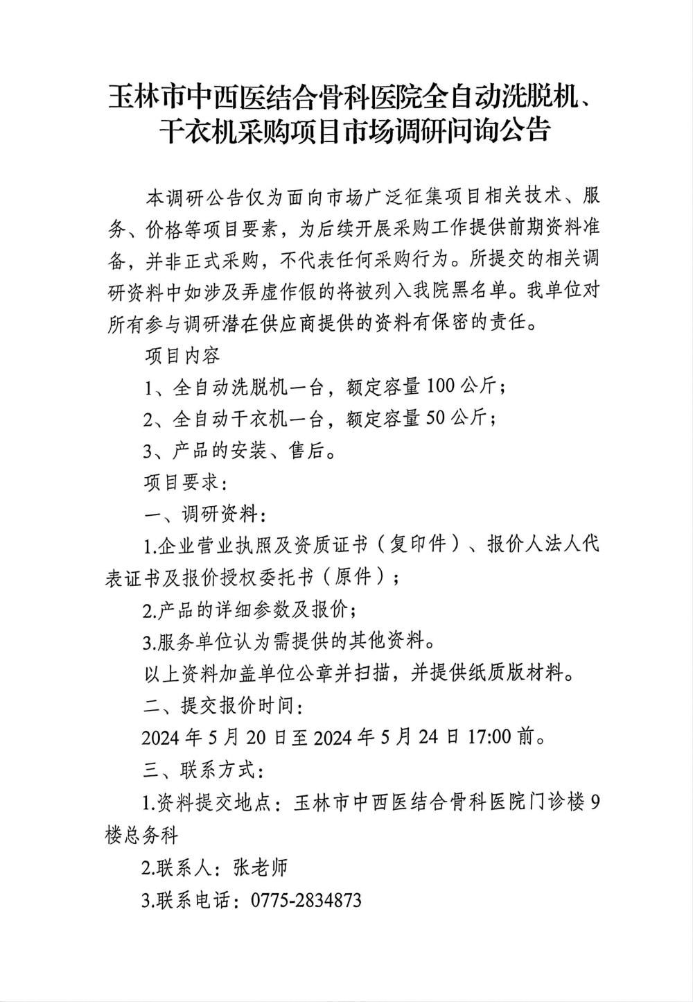 玉林市中西医结合骨科医院全自动洗脱机、干衣机采购项目市场调研问询公告