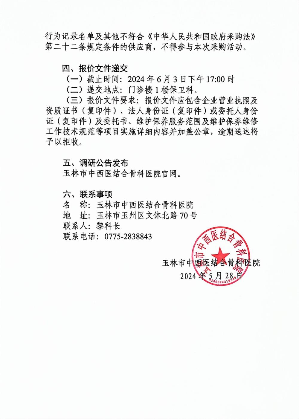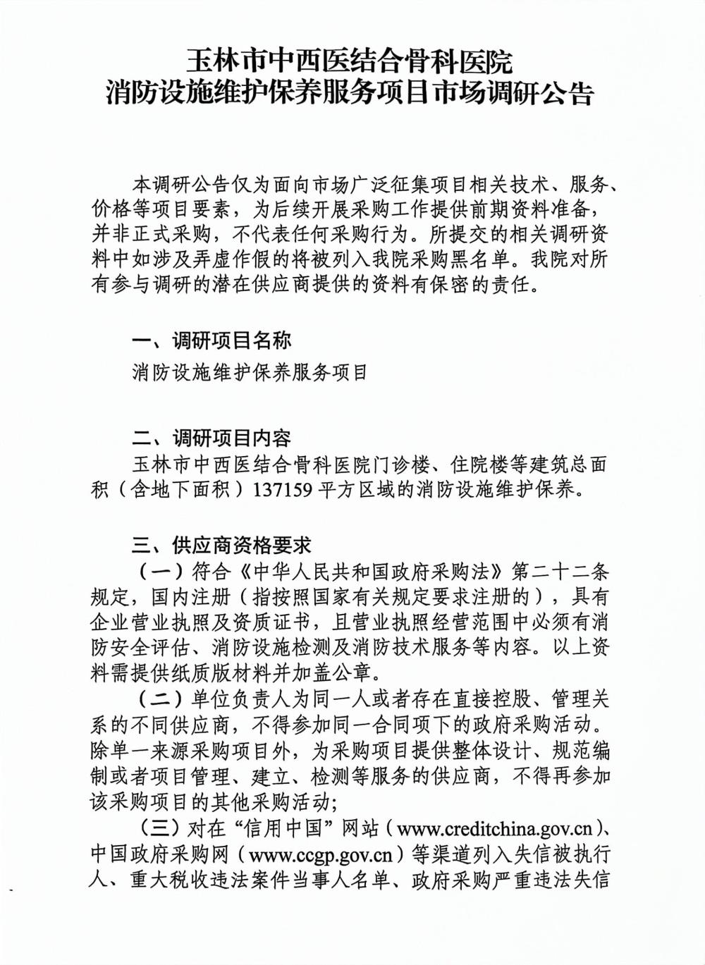 玉林市中西医结合骨科医院消防设施维护保养服务项目市场调研公告