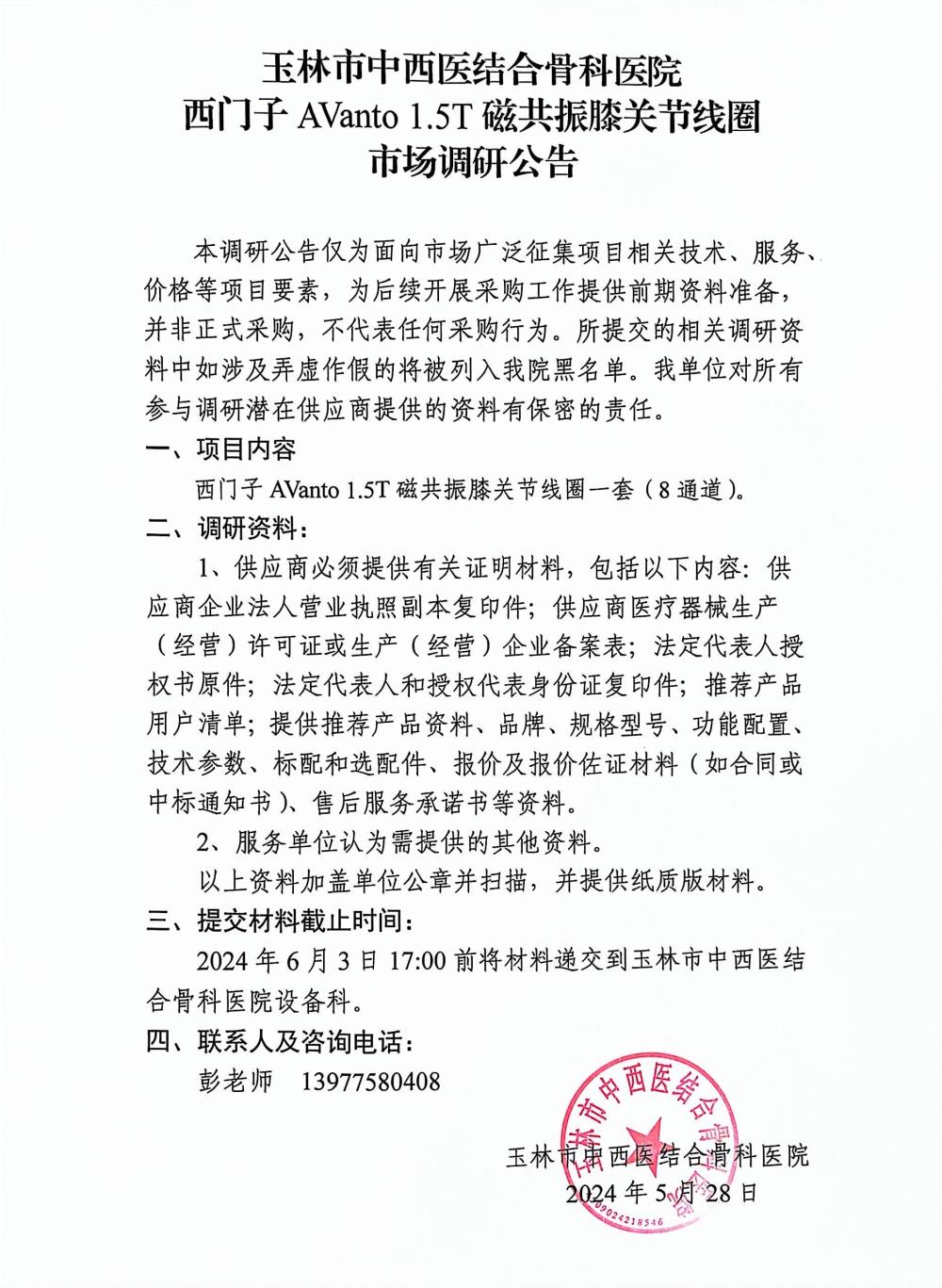 玉林市中西医结合骨科医院 西门子AVanto 1.5T磁共振膝关节线圈 市场调研公告
