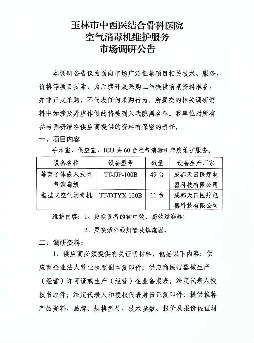 玉林市中西医结合骨科医院 空气消毒机维护服务 市场调研公告