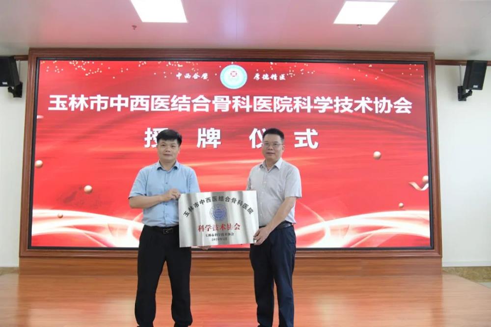 5月30日,全国科技工作者日之际,玉林市科学技术协会来到玉林市中西医结合骨科医院,为玉林市中西医结合骨科医院科学技术协会举行隆重的授牌仪式。玉林市科学技术协会党组书记、主席谢玉圣,玉林市中西医结合骨科医院党委副书记、院长梁博伟出席授牌仪式。