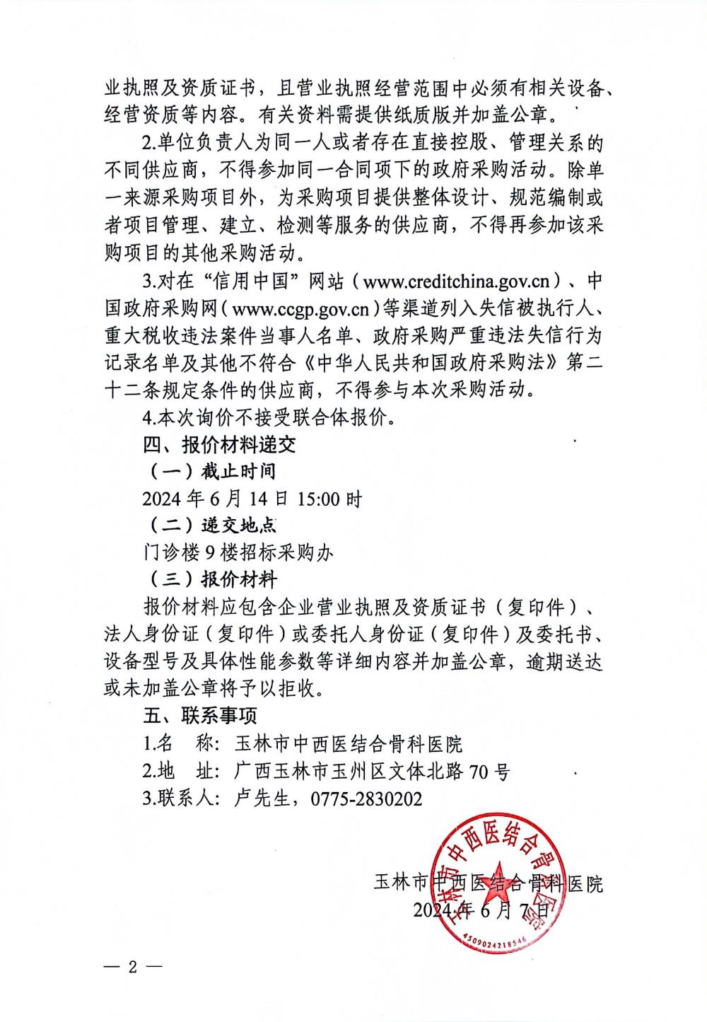 玉林市中西医结合骨科医院 常压煎药机采购项目询价公告