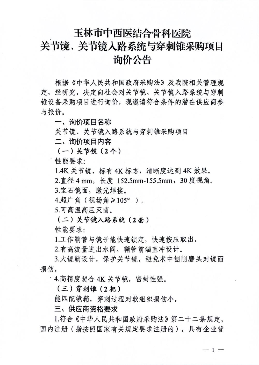 玉林市中西医结合骨科医院关节镜、关节镜入路系统与穿刺锥采购项目询价公告
