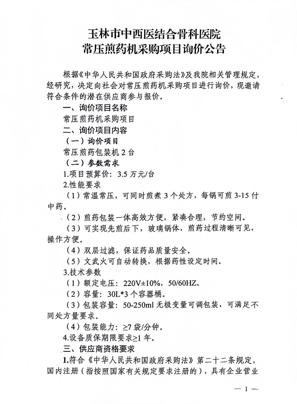 玉林市中西医结合骨科医院 常压煎药机采购项目询价公告