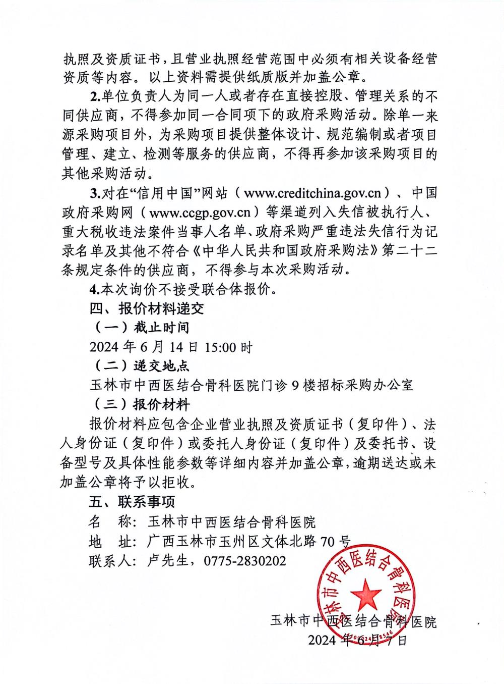 玉林市中西医结合骨科医院液体包装机采购项目询价公告
