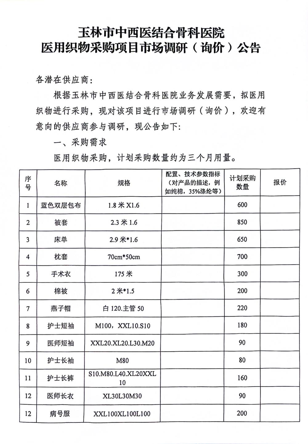 玉林市中西医结合骨科医院医用织物采购项目市场调研(询价)公告