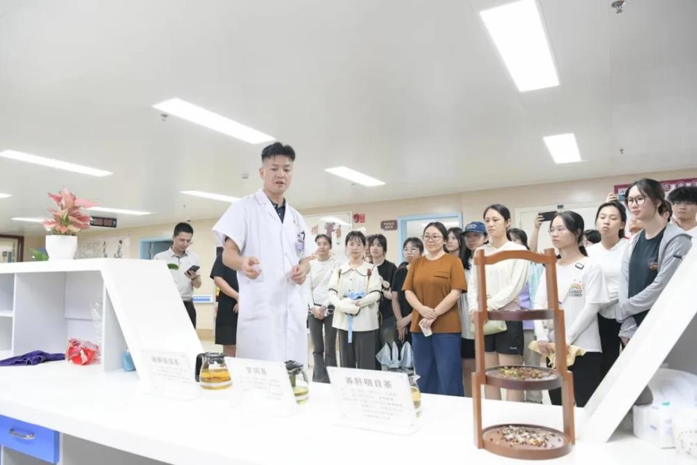 在治未病科(中医经典病房),科室负责人马鹏主任向大家介绍了科室的特色制剂和特色治疗。师生们对小针刀、温针和中药熏蒸等这些特色疗法表现出浓厚的兴趣。药膳是我院在中医药传承创新工作的一大亮点,马主任还讲解了我院的药膳,包括养肝明目茶、甘润茶和玫瑰解郁茶等,展示了中医药在日常保健和治疗中的多样化应用,让大家对中医药的养生理念有了更深的理解。