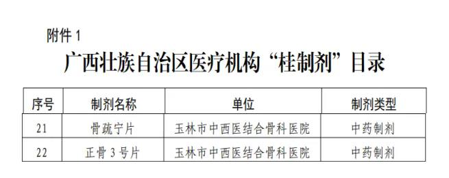 近日,在自治区中医药局等5部门开展的医疗机构“桂制剂”遴选工作中,经过设区市推荐、专家评审、部门审定等环节,确定了23个医疗机构制剂纳入自治区医疗机构“桂制剂”目录,其中玉林市中西医结合骨科医院2个中药制剂榜上有名,分别是:“骨疏宁片”、“ 正骨3号片”。