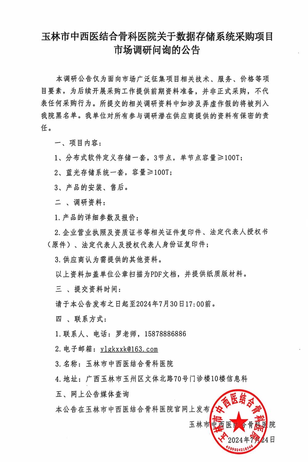 玉林市中西医结合骨科医院关于数据存储系统采购项目市场调研问询的公告