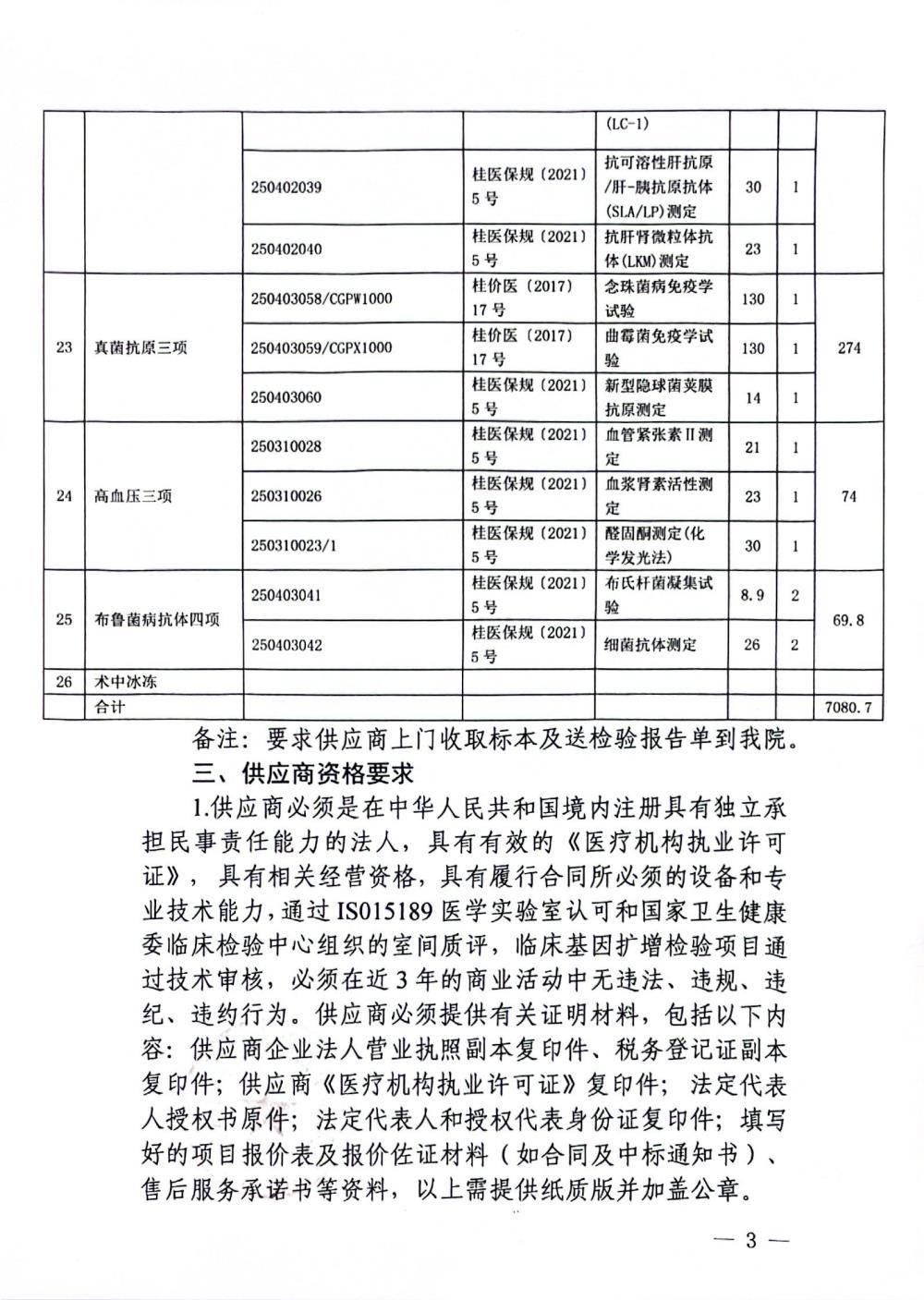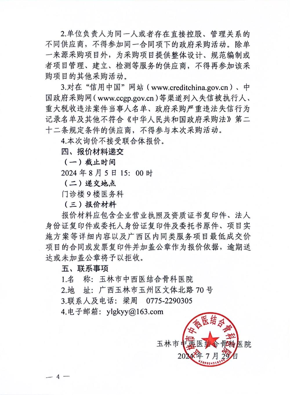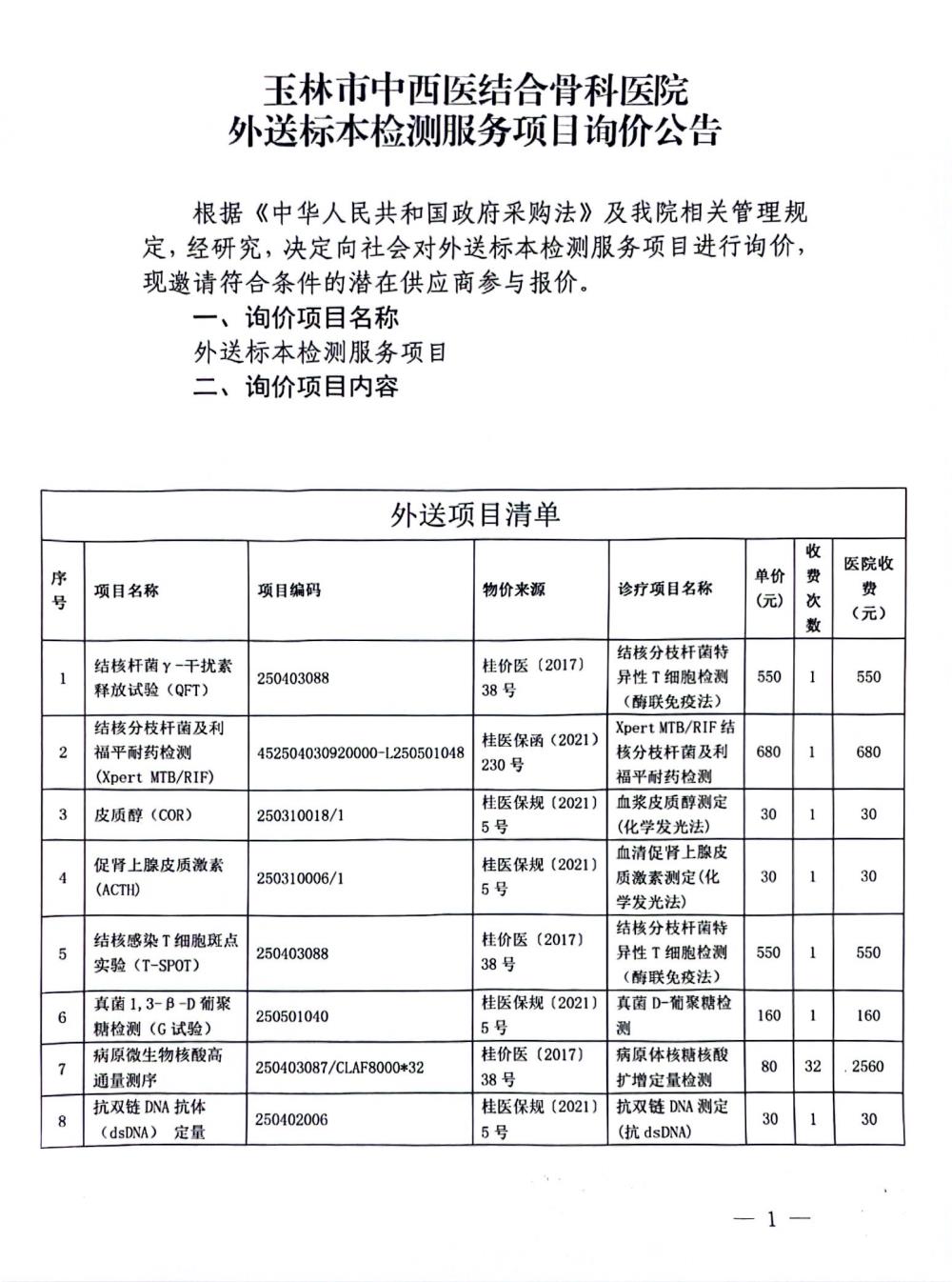 玉林市中西医结合骨科医院外送标本检测服务项目询价公告