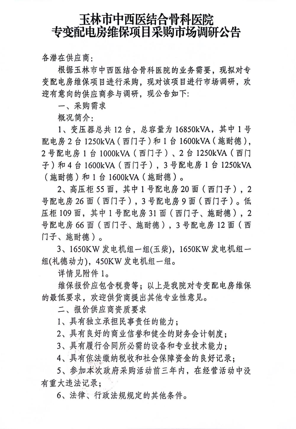 玉林市中西医结合骨科医院专变配电房维保项目采购市场调研公告