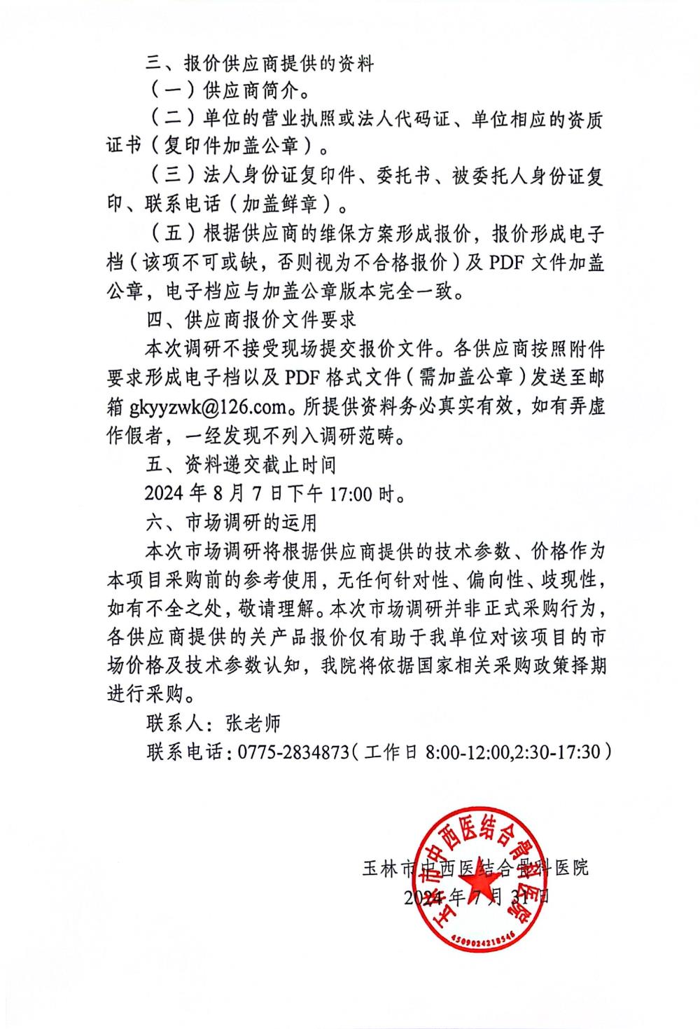 玉林市中西医结合骨科医院外送标本检测服务项目询价公告