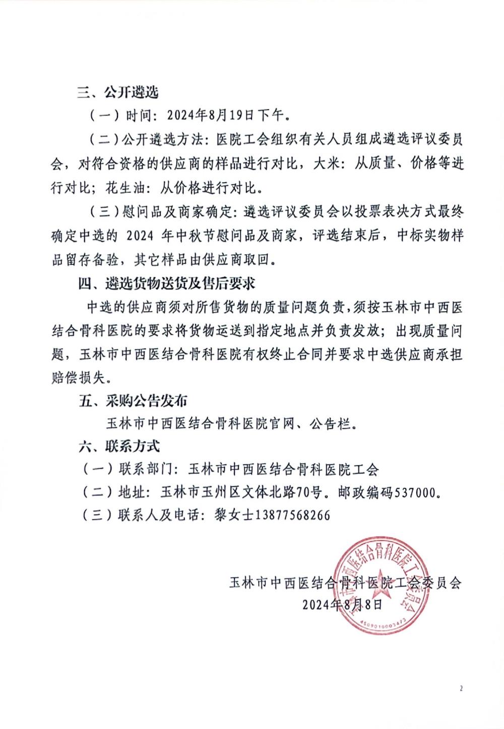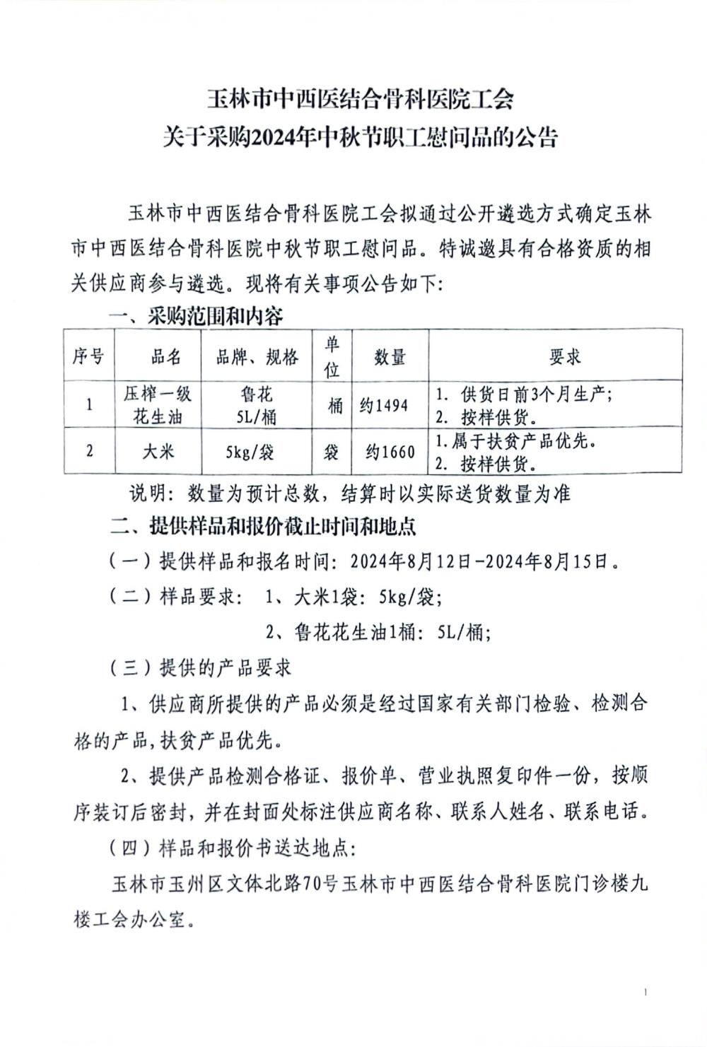 玉林市中西医结合骨科医院工会关于采购2024年中秋节职工慰问品的公告