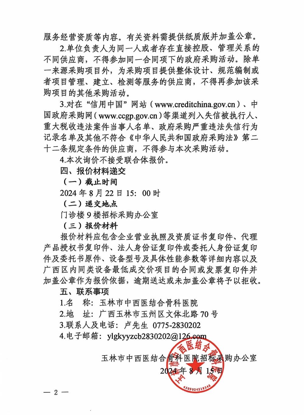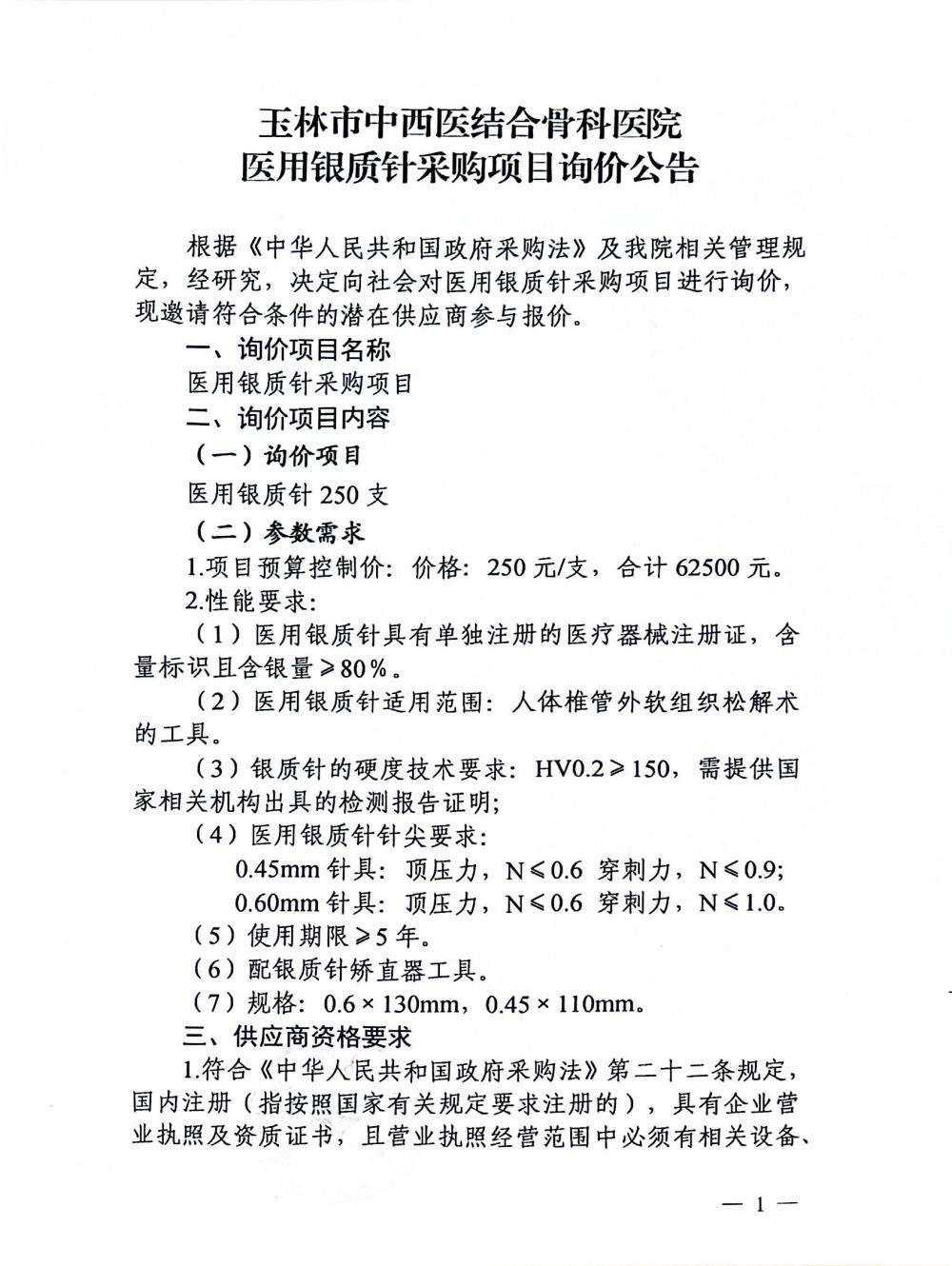 玉林市中西医结合骨科医院医用银质针采购项目询价公告