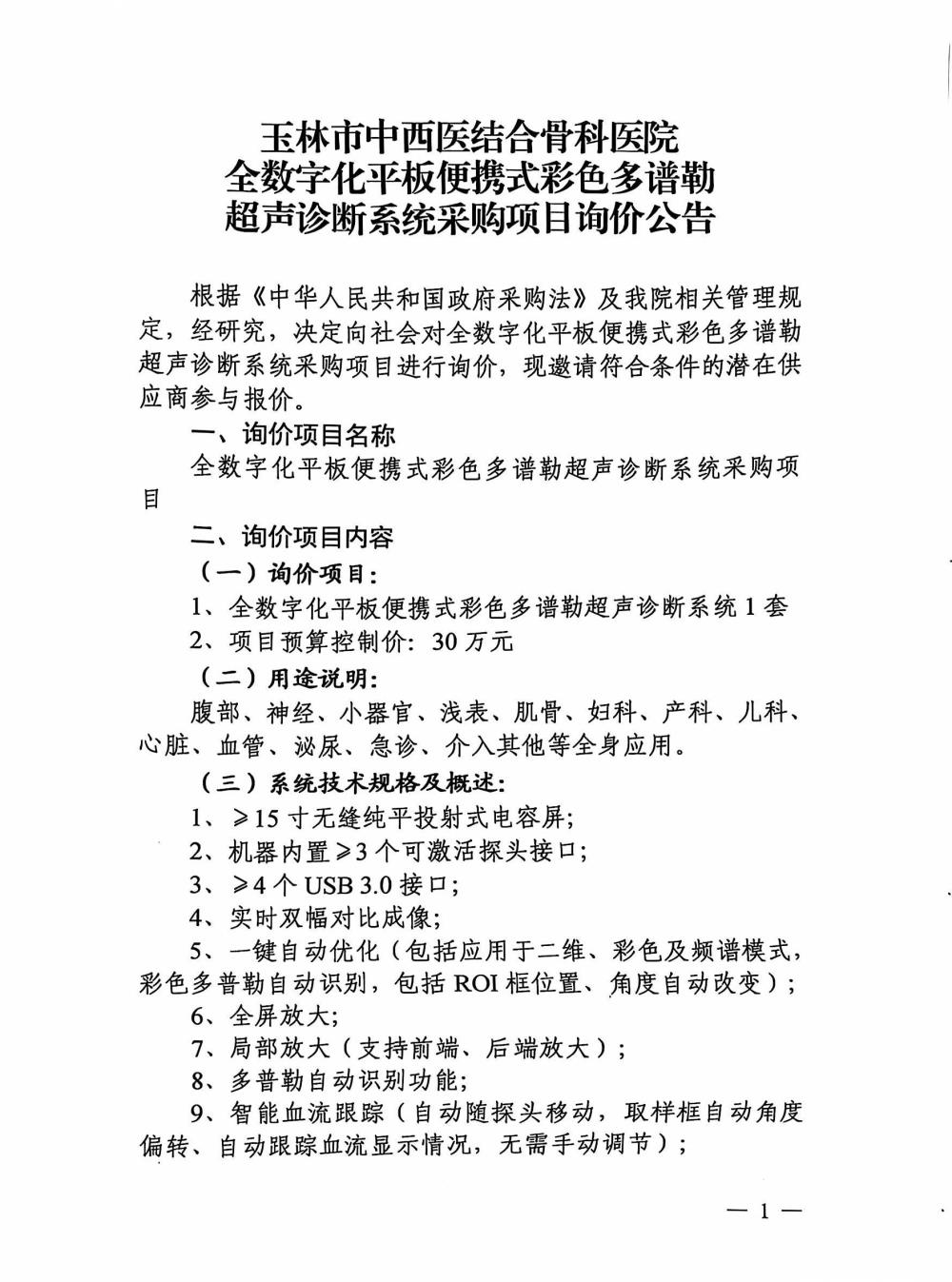 玉林市中西医结合骨科医院全数字化平板便携式彩色多谱勒超声诊断系统采购项目询价公告