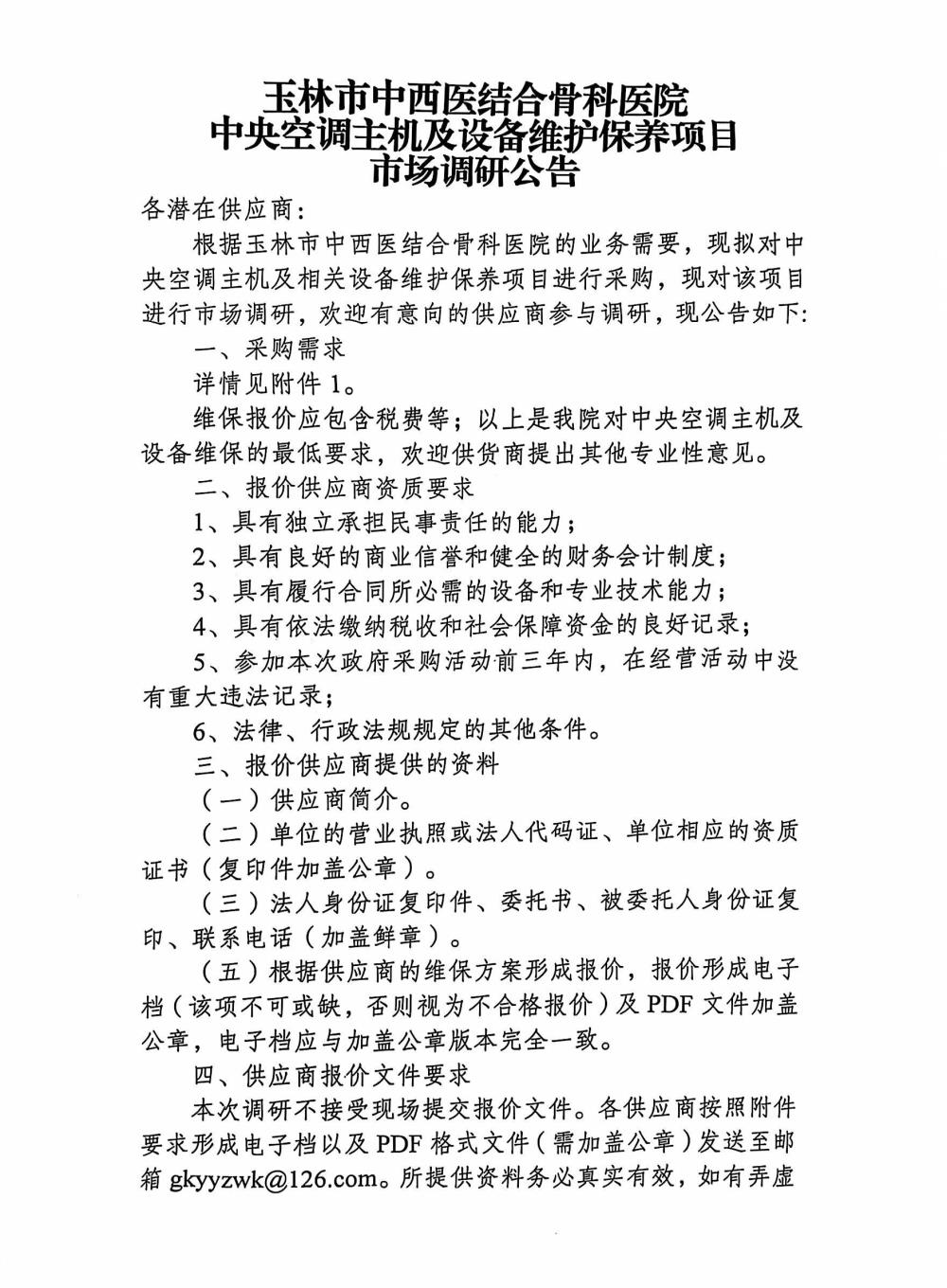玉林市中西医结合骨科医院中央空调主机及设备维护保养项目市场调研公告