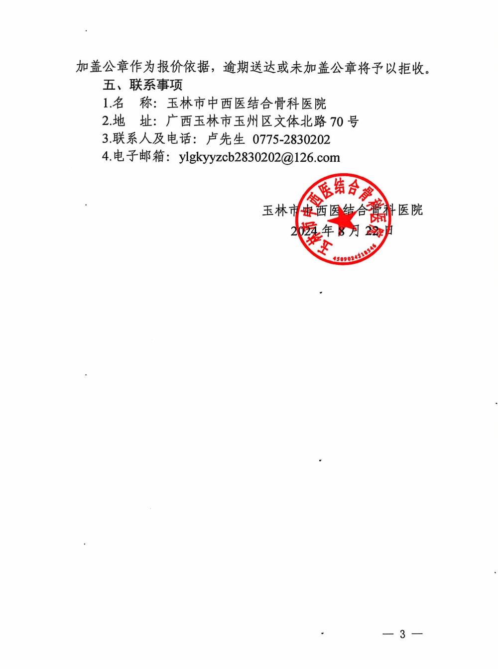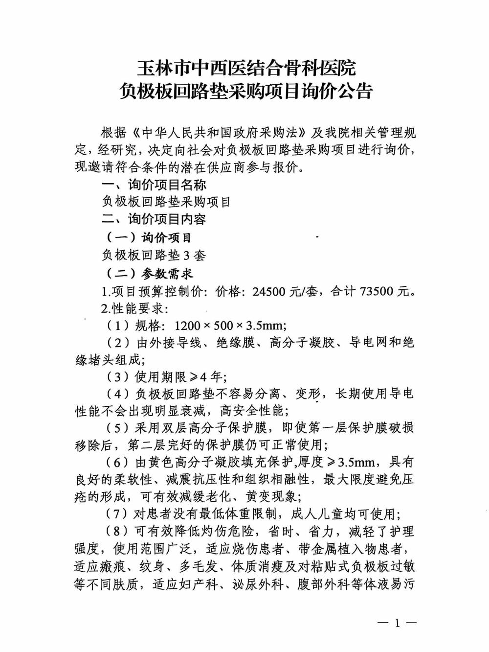 玉林市中西医结合骨科医院负极板回路垫采购项目询价公告