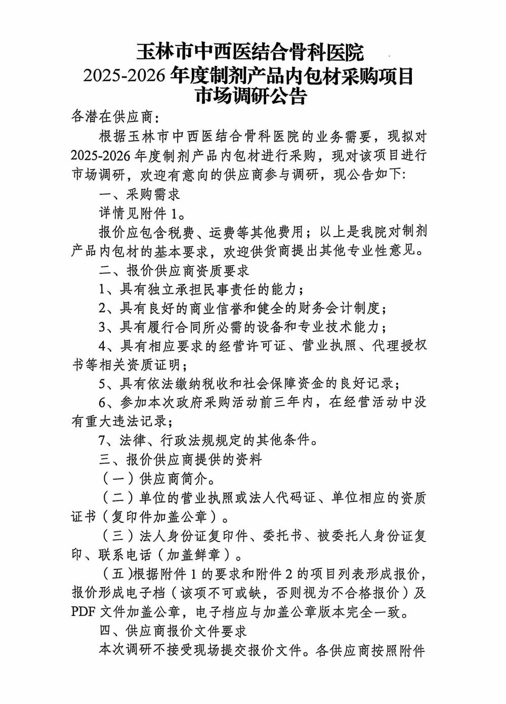 玉林市中西医结合骨科医院2025-2026年度制剂产品内包材采购项目市场调研公告