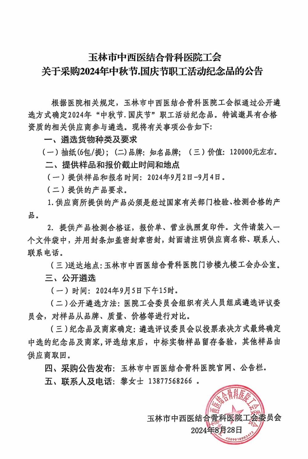 玉林市中西医结合骨科医院工会关于采购2024年中秋节.国庆节职工活动纪念品的公告