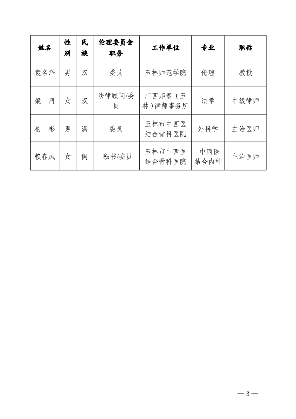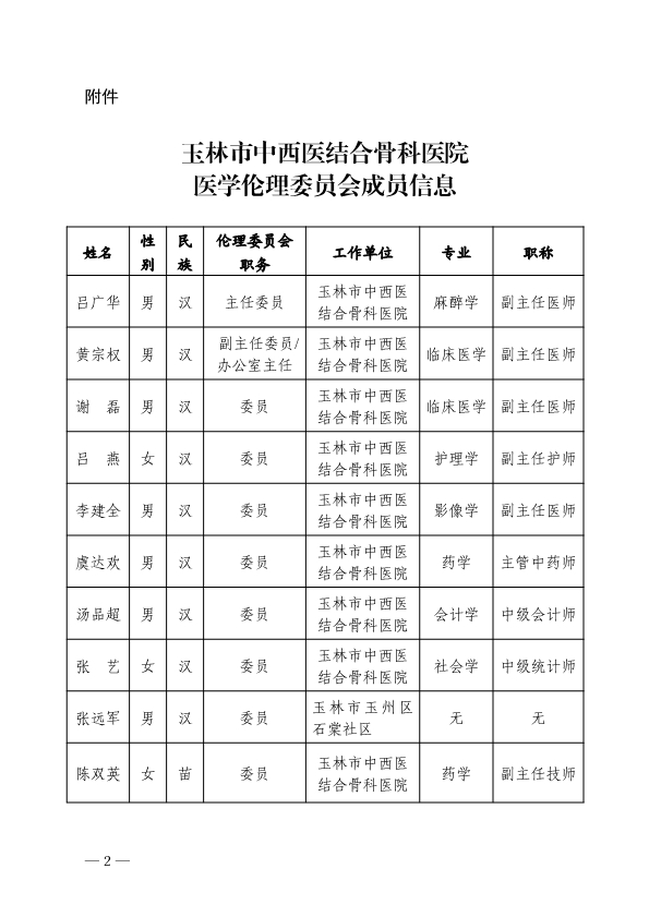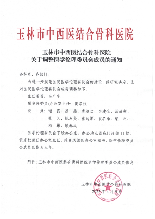 玉林市中西医结合骨科医院关于调整医学伦理委员会成员的通知