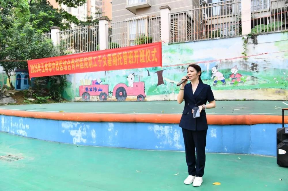 ▲玉林市中西医结合骨科医院党委副书记、工会主席吕广华主持托管班开班仪式