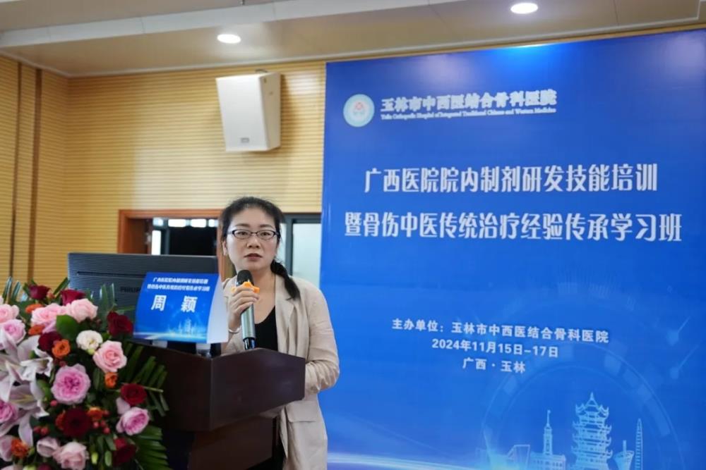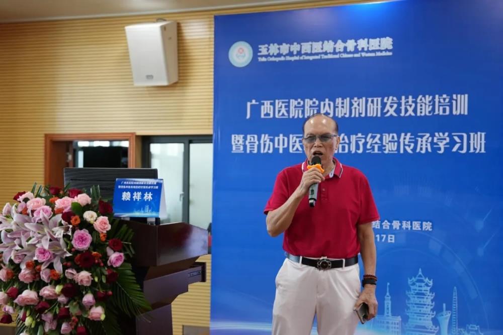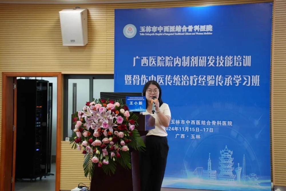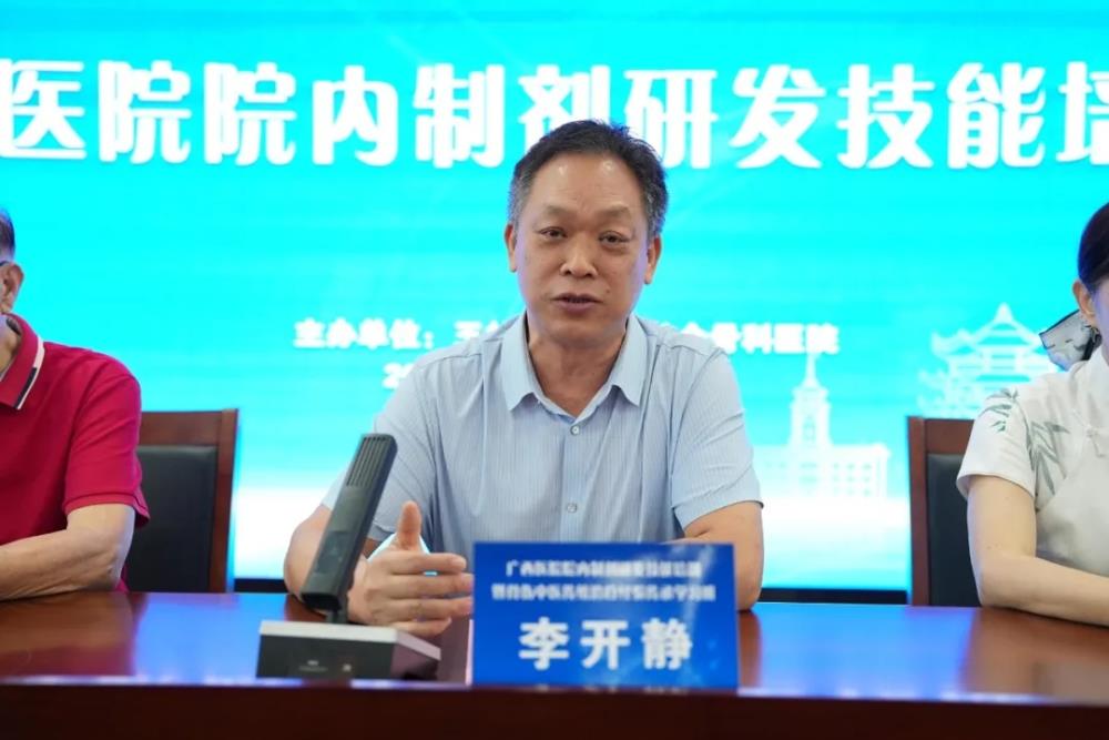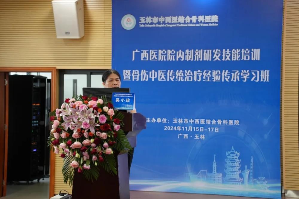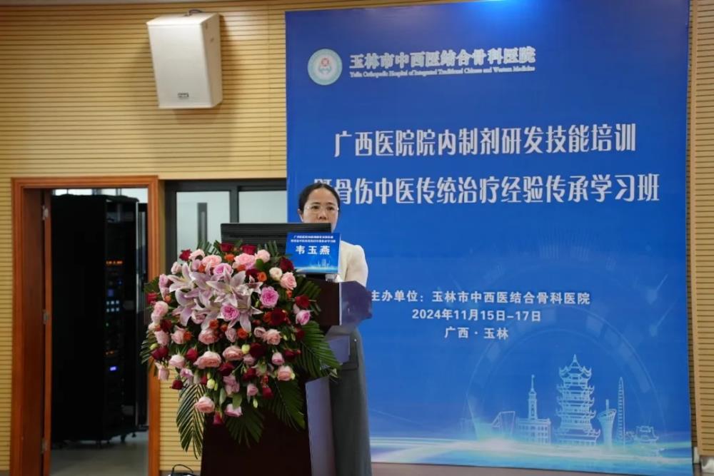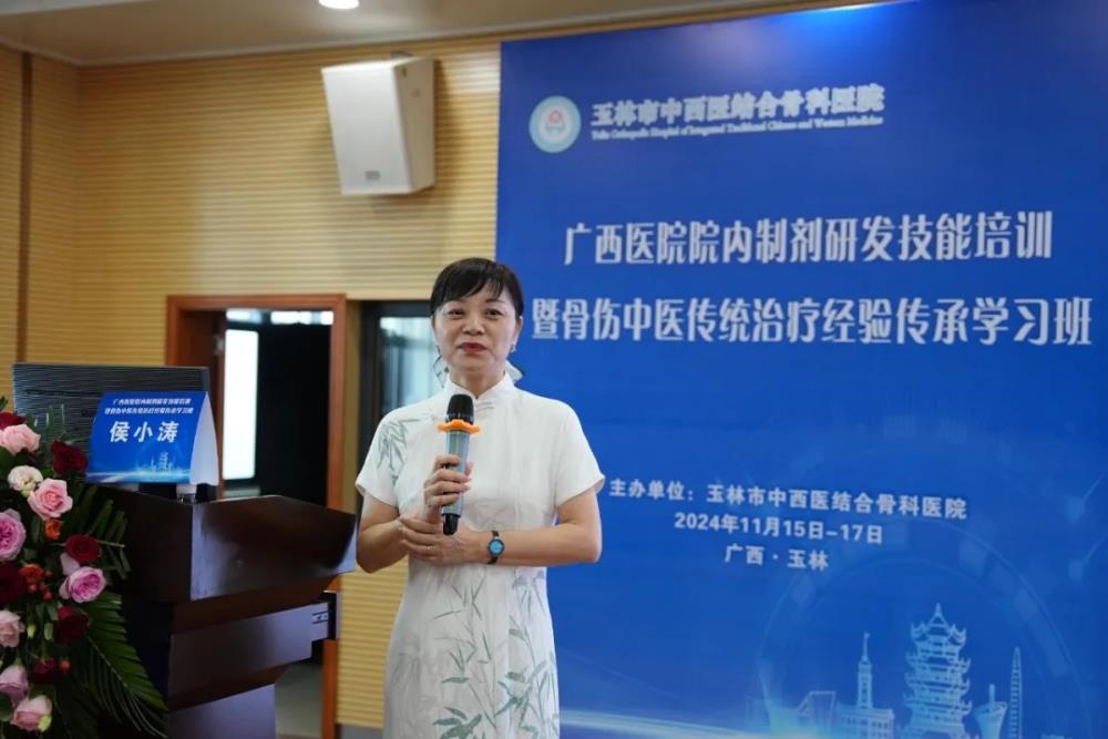 玉林市中西医结合骨科医院李开静副院长致辞表示祝愿广西医院院内制剂研发技能培训暨骨伤中医传统治疗经验传承学习班能顺利召开,希望来参会的各位同仁能有所收获,不断提高自身专业技能,为八桂百姓健康事业做出更大贡献。