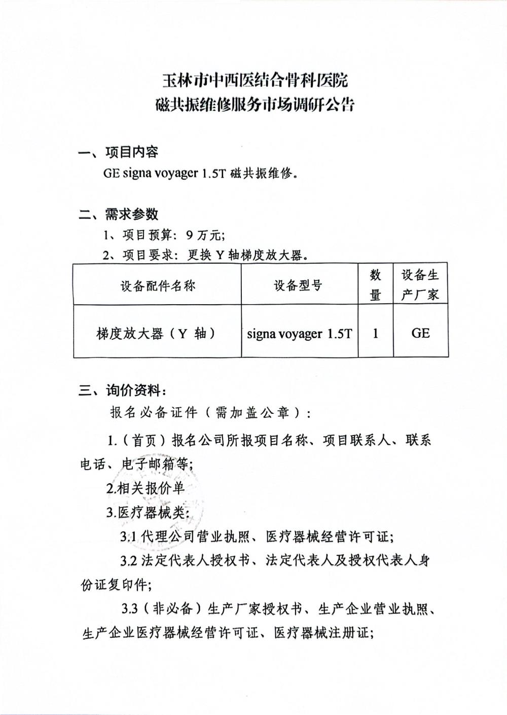 玉林市中西医结合骨科医院磁共振维修服务市场调研公告