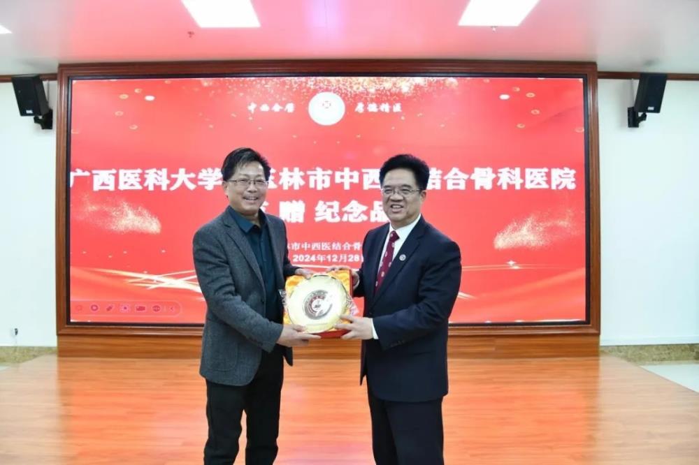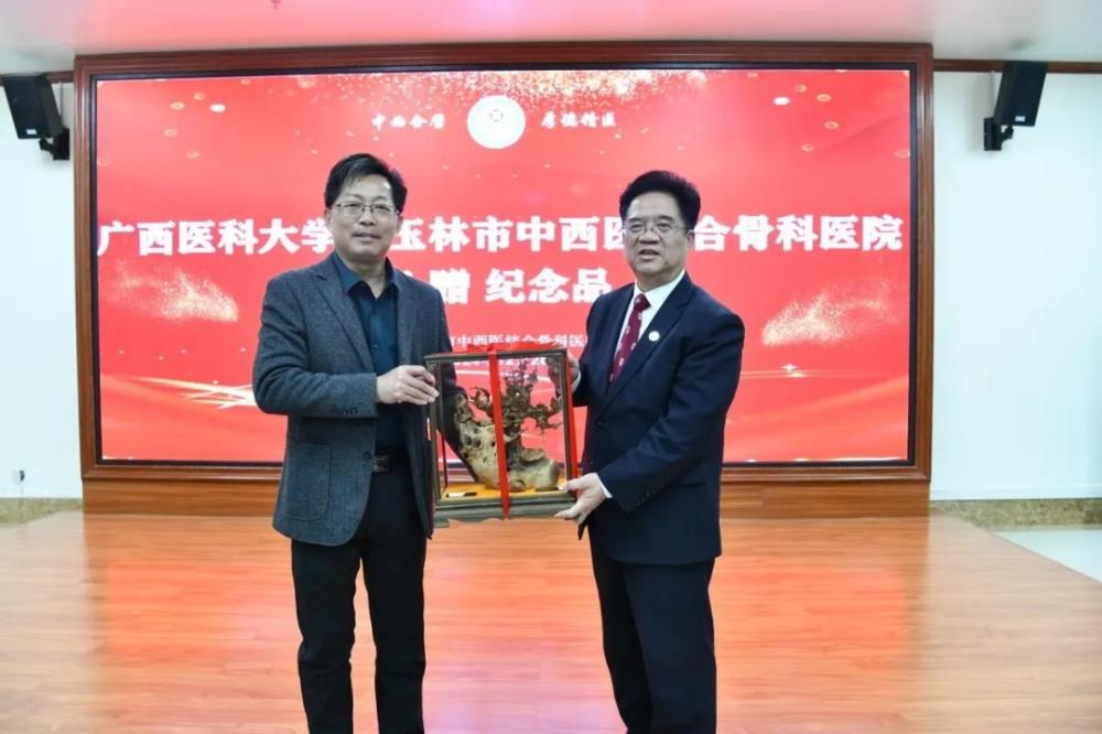 随后,广西医科大学曾志羽校长(右)、玉林市中西医结合骨科医院党委书记陈正其代表双方互赠纪念品,表达合作意愿和美好祝愿。