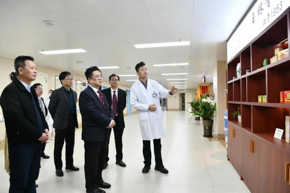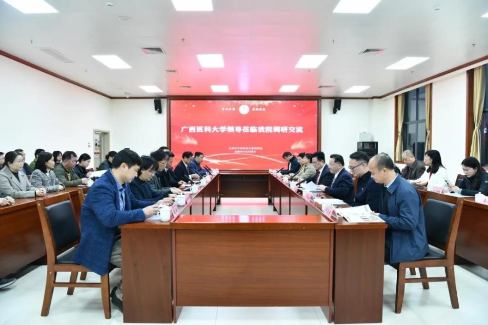 12月28日,广西医科大学校长曾志羽、副校长卢德成一行莅临我院,就医教协同及产学研合作情况进行考察调研。玉林市人民政府副秘书长吕湖川,玉林市卫生健康委党组书记、主任吴帅,玉林市卫生健康委副主任杨媚,广西医科大学相关部门负责人、玉林市卫生健康委相关部门负责人及玉林市中西医结合骨科医院领导班子成员陪同调研并座谈。