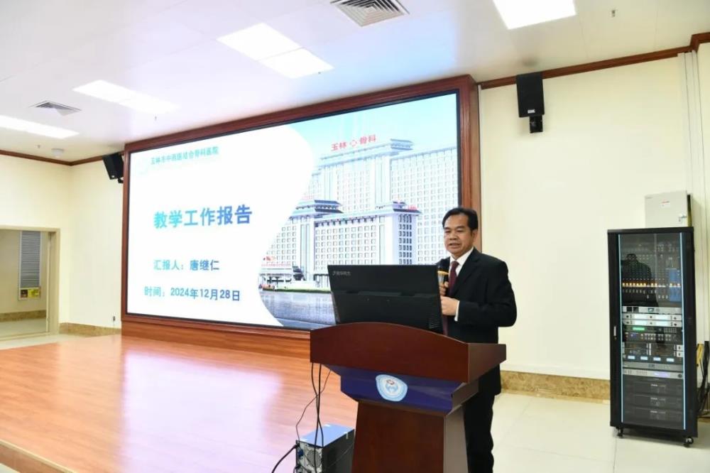 ▲玉林市中西医结合骨科医院党委副书记、院长唐继仁介绍医院教学工作情况