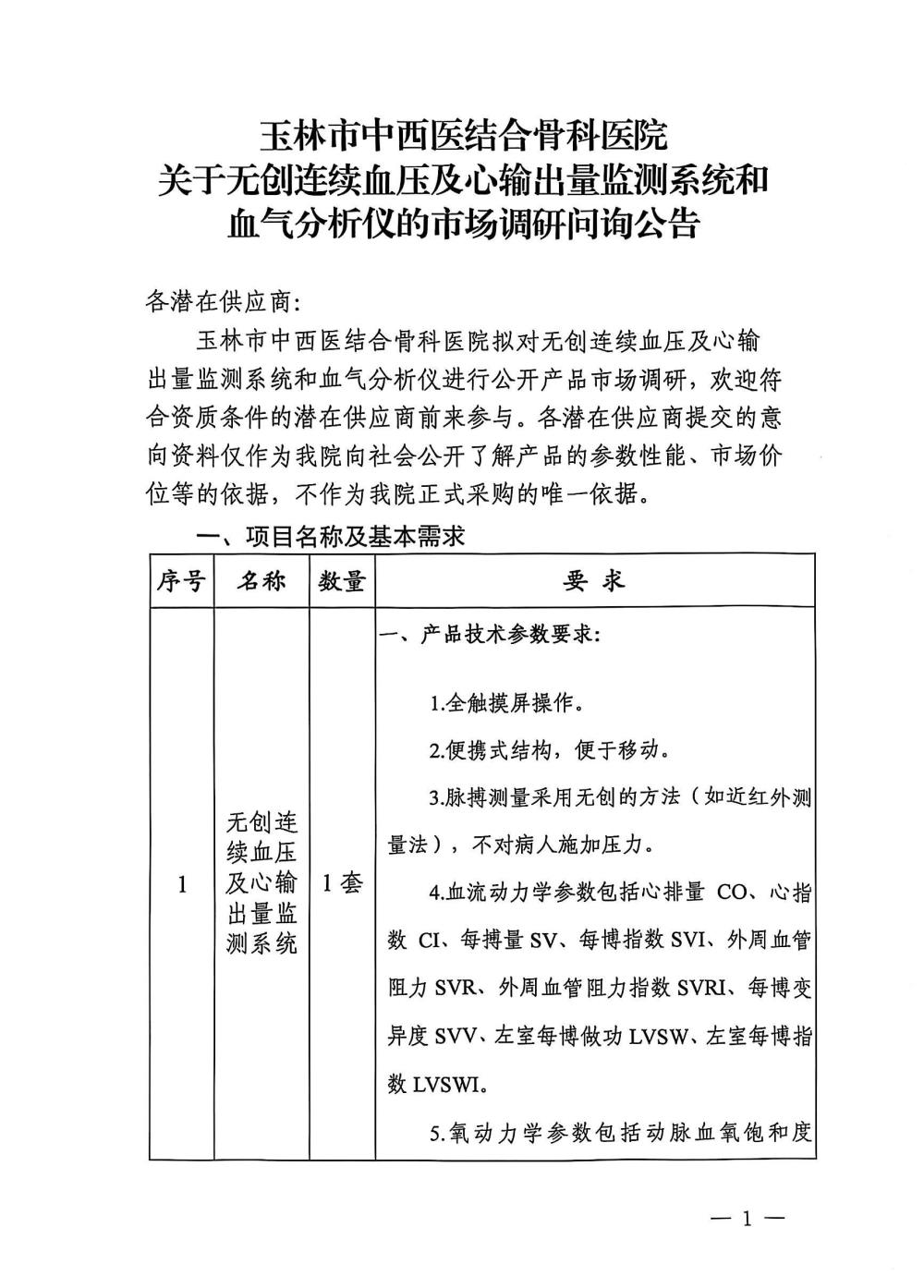玉林市中西医结合骨科医院关于无创连续血压及心输出量监测系统和血气分析仪的市场调研问询公告