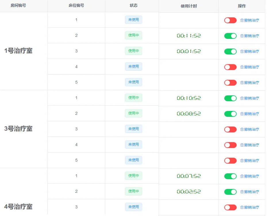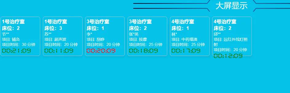 大屏数据动态显示科室目前所有正在使用治疗床的信息,治疗床使用时长以倒计时形式显示。当治疗时间结束,相应床位的时间即显示红色并响起音乐声提醒,工作人员根据信息提醒及时前往处理,确保服务流程的无缝对接,高效完成床位周转。