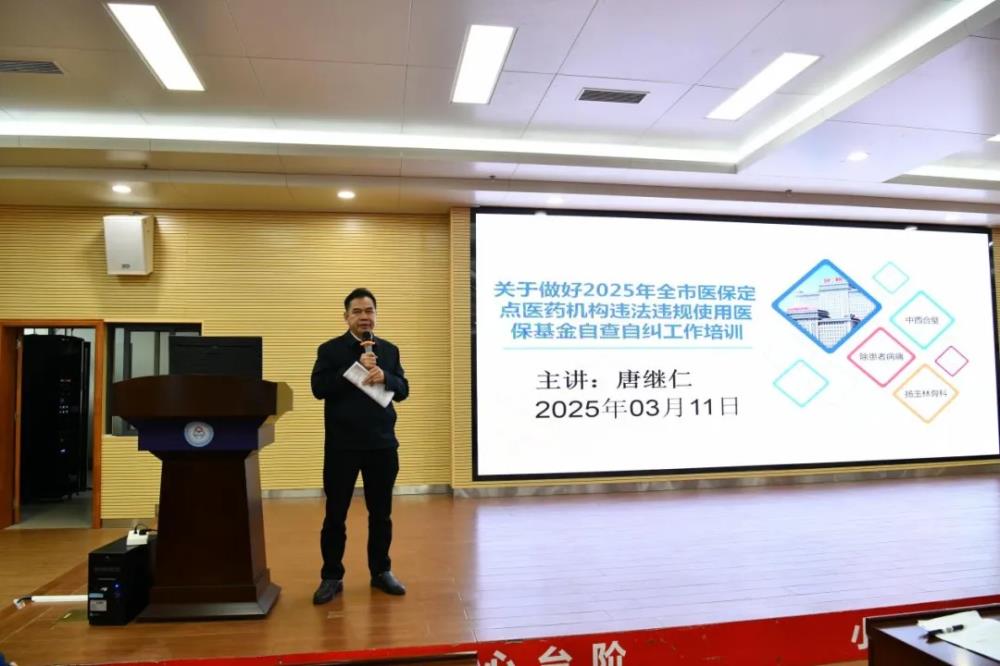 会上,医院党委副书记、院长唐继仁首先对关于做好2025年全市医保定点医药机构违法违规使用医保基金自查自纠工作进行了详细培训,强调要按照《国务院办公厅关于加强医疗保障基金使用常态化监管的实施意见》合理合规使用医保资金。他要求全体临床医师认真阅读学习医保相关文件,了解相关政策,了解每一个医保收费项目的定义及内涵,避免超标准收费、重复收费、过度检查等违规行为。