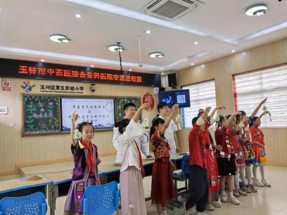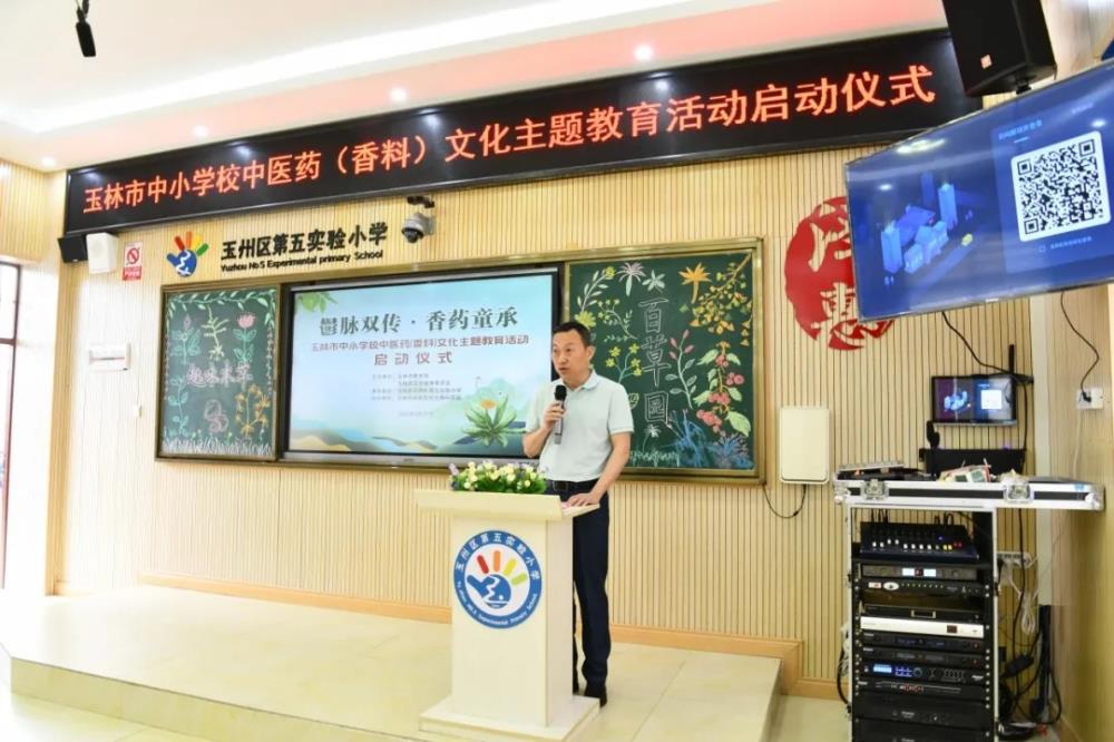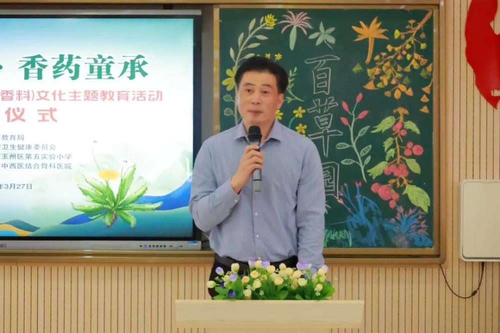 3月27日上午,由玉林市教育局、玉林市卫生健康委员会联合主办,玉州区第五实验小学承办,玉林市中西医结合骨科医院协办的"鬱脉双传·香药童承"中医药文化进校园主题活动启动仪式在玉州区第五实验小学隆重举行。玉林市教育局副局长梁兴波、玉林市卫生健康委员会计划生育协会副会长刘金海,以及我院纪委书记丘增堂等领导出席活动并致辞。