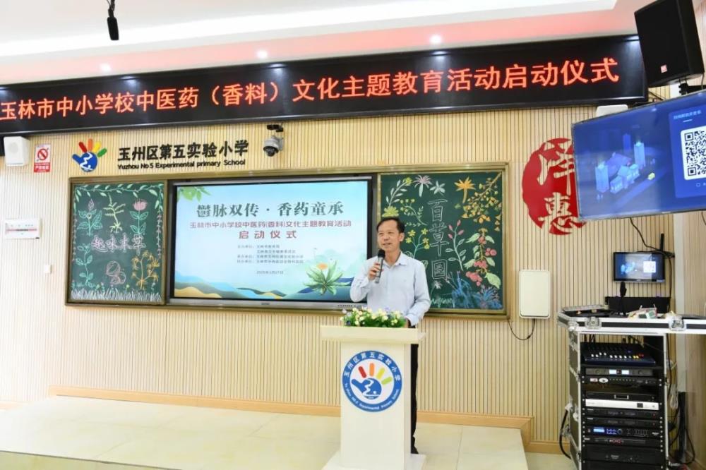 启动仪式上,市教育局梁兴波副局长在会上发言。他强调,传承发展中医药文化是新时代教育赋予的重要使命。教育部门要充分发挥玉林"南方药都"的资源优势,通过校院合作、课程融合、实践体验等多种形式,打造具有玉林特色的中医药文化育人品牌。要以此次活动为契机,将中医药文化教育与“五育并举”深度融合,教育引导学生争做“知药香、懂传承、有担当”的新时代少年。▲市卫健委计生协会副会长刘金海发表讲话