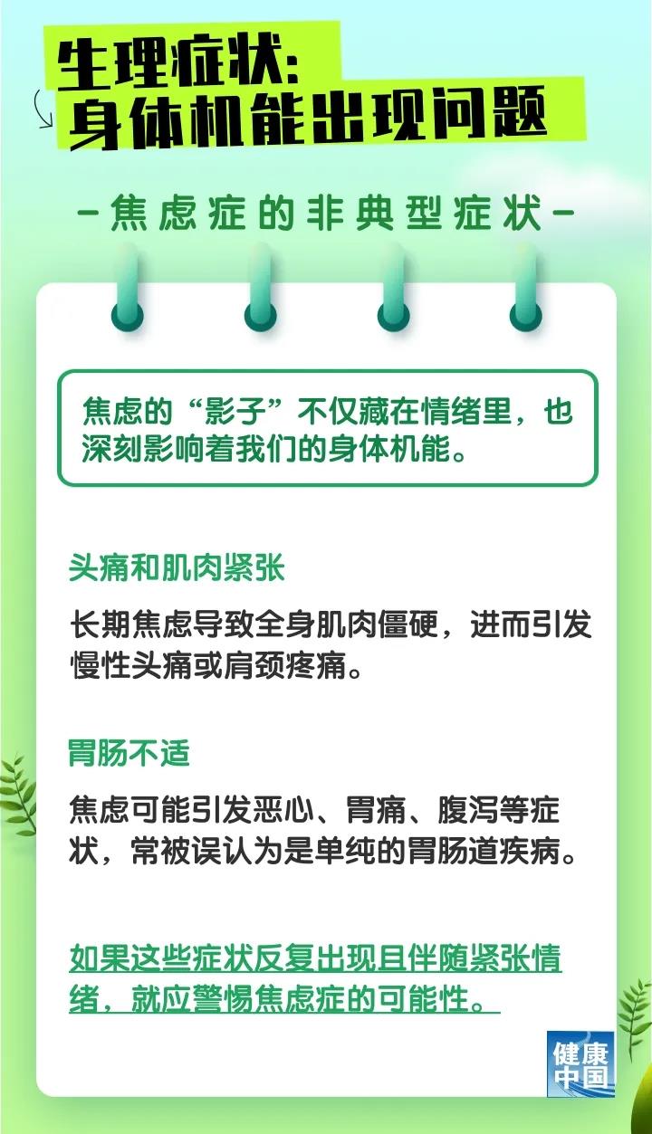 焦虑症的非典型症状涵盖生理、认知和行为多个方面,很多患者容易忽视,进而延误治疗时机。职场的朋友,快来看看你有没有以下症状吧!
