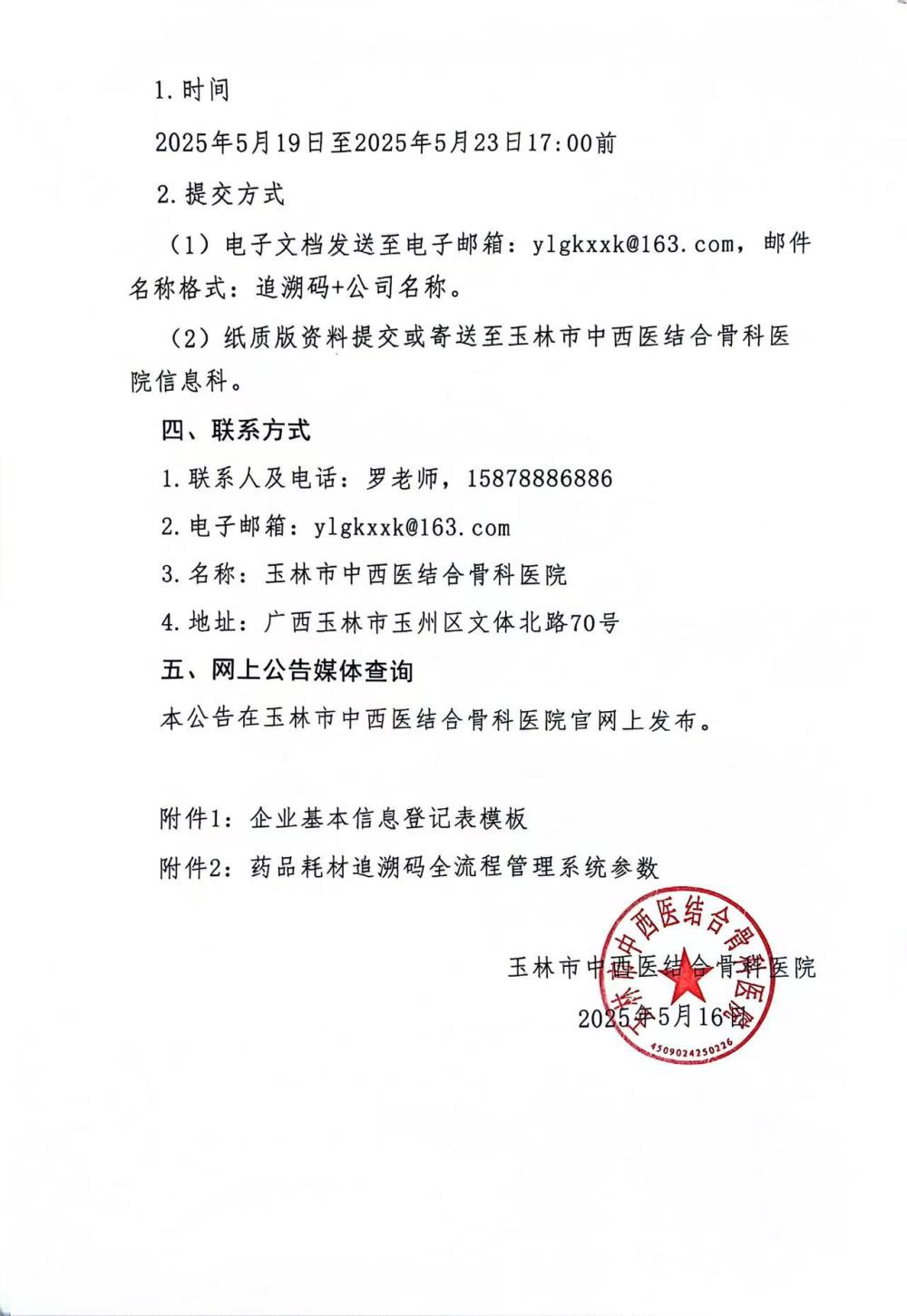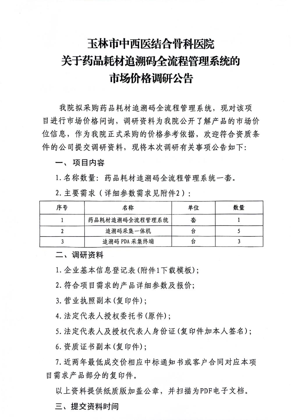 玉林市中西医结合骨科医院关于药品耗材追溯码全流程管理系统的市场价格调研公告