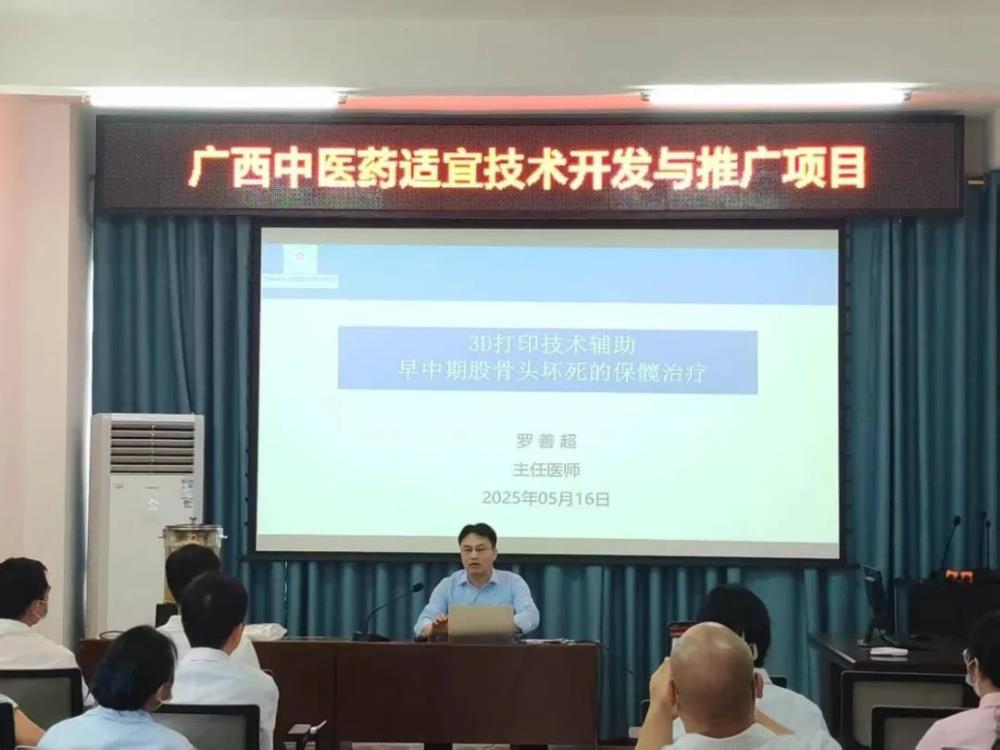 髋关节三科主任罗善超博士后(主任医师)进行 “3D 打印技术辅助早中期股骨头坏死的保髋治疗” 授课,将前沿的技术与传统中医药理论相互交融,使大家认识到科技赋能中医药在骨科领域所释放出的全新活力。在整个授课过程中,现场不时响起阵阵掌声,体现了基层医院对本次广西中医药适宜技术开发与推广项目进社区的积极响应与热切期望。