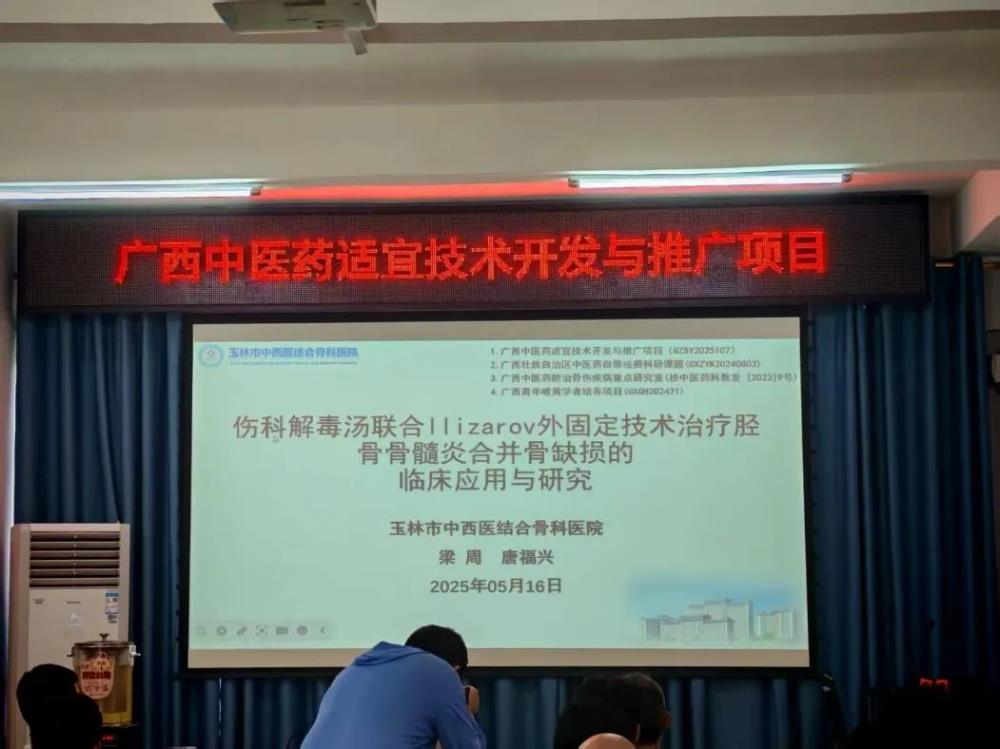 接着, 唐福兴博士继续开展广西中医药适宜技术开发与推广项目“伤科解毒汤联合llizarov外固定技术治疗胫骨骨髓炎合并骨缺损的临床应用与研究” 授课与推广。凭借详实的案例、严谨的数据,展现出中医药与现代外固定技术相结合的独特魅力,体现了我院在骨科疑难病症治疗上的创新探索,引发听众对中西医协同治疗骨伤的浓厚兴趣与深入思考。