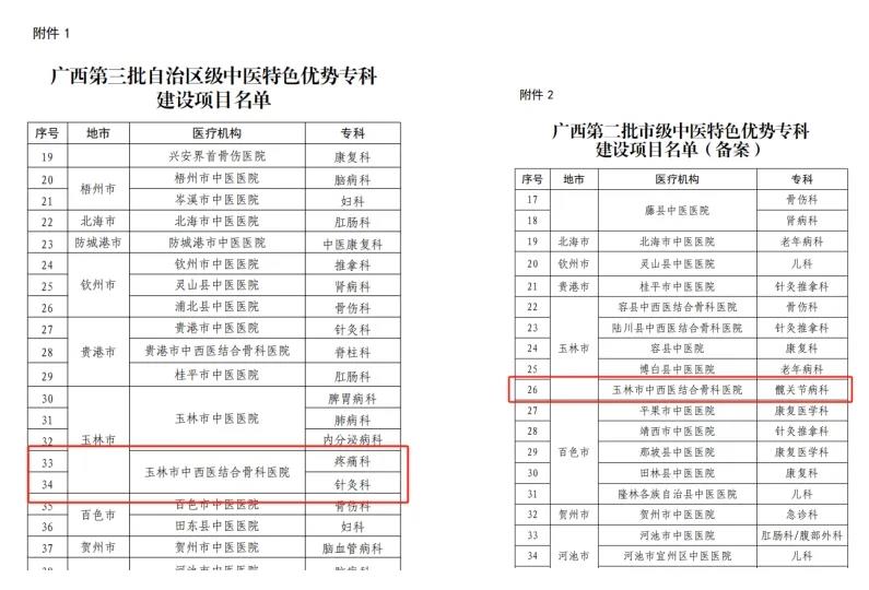 5月13日,广西壮族自治区中医药管理局公布了第三批自治区级中医特色优势专科建设项目及第二批市级中医特色优势专科建设项目名单。经自治区中医药局审核,我院疼痛科、针灸科荣列第三批自治区级中医特色优势专科建设项目,髋关节病科获得第二批市级中医特色优势专科建设项目备案。