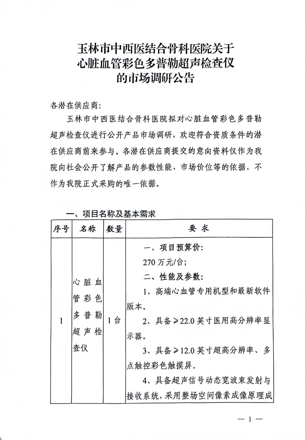 玉林市中西医结合骨科医院关于心脏血管彩色多普勒超声检查仪的市场调研公告